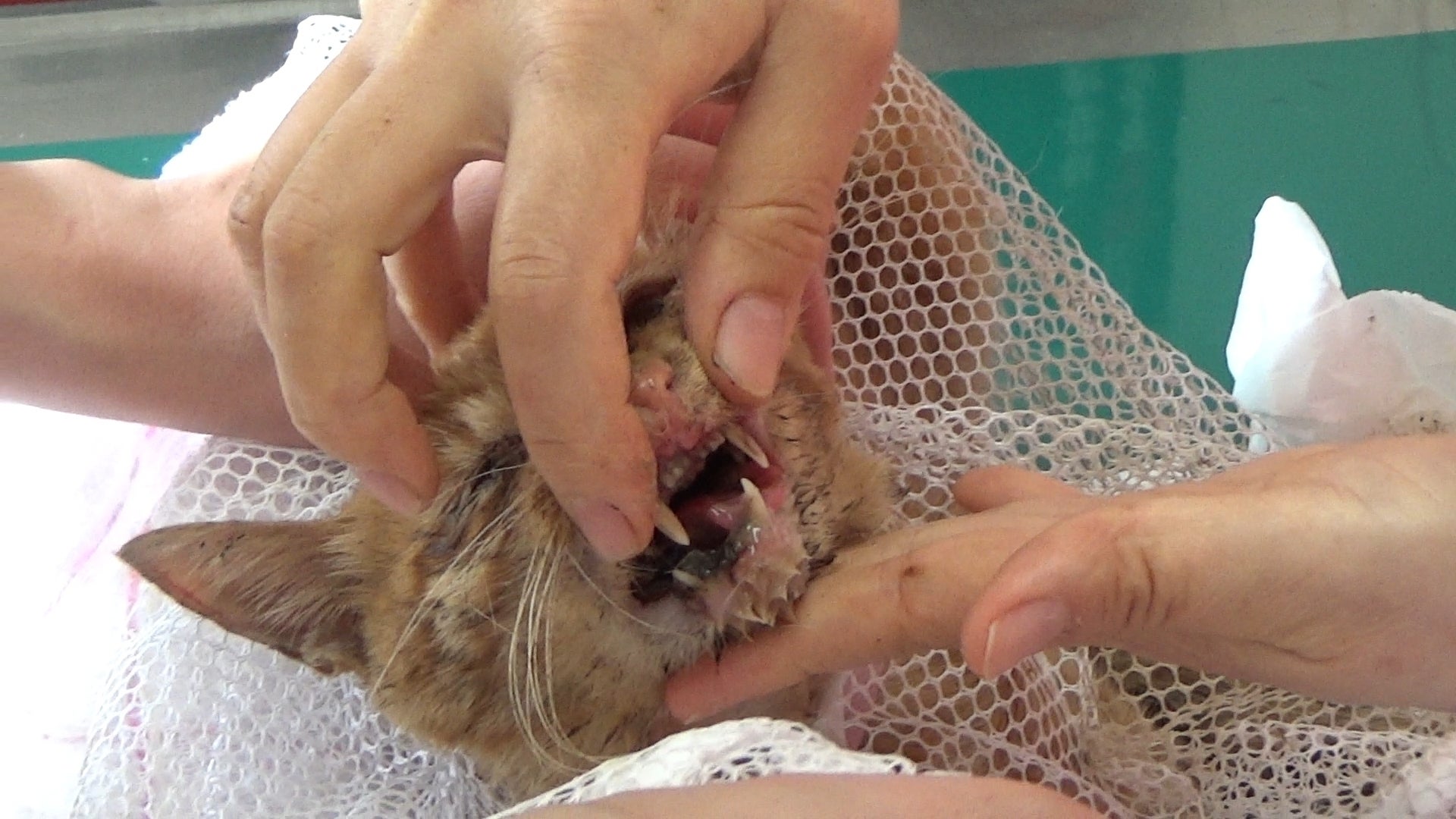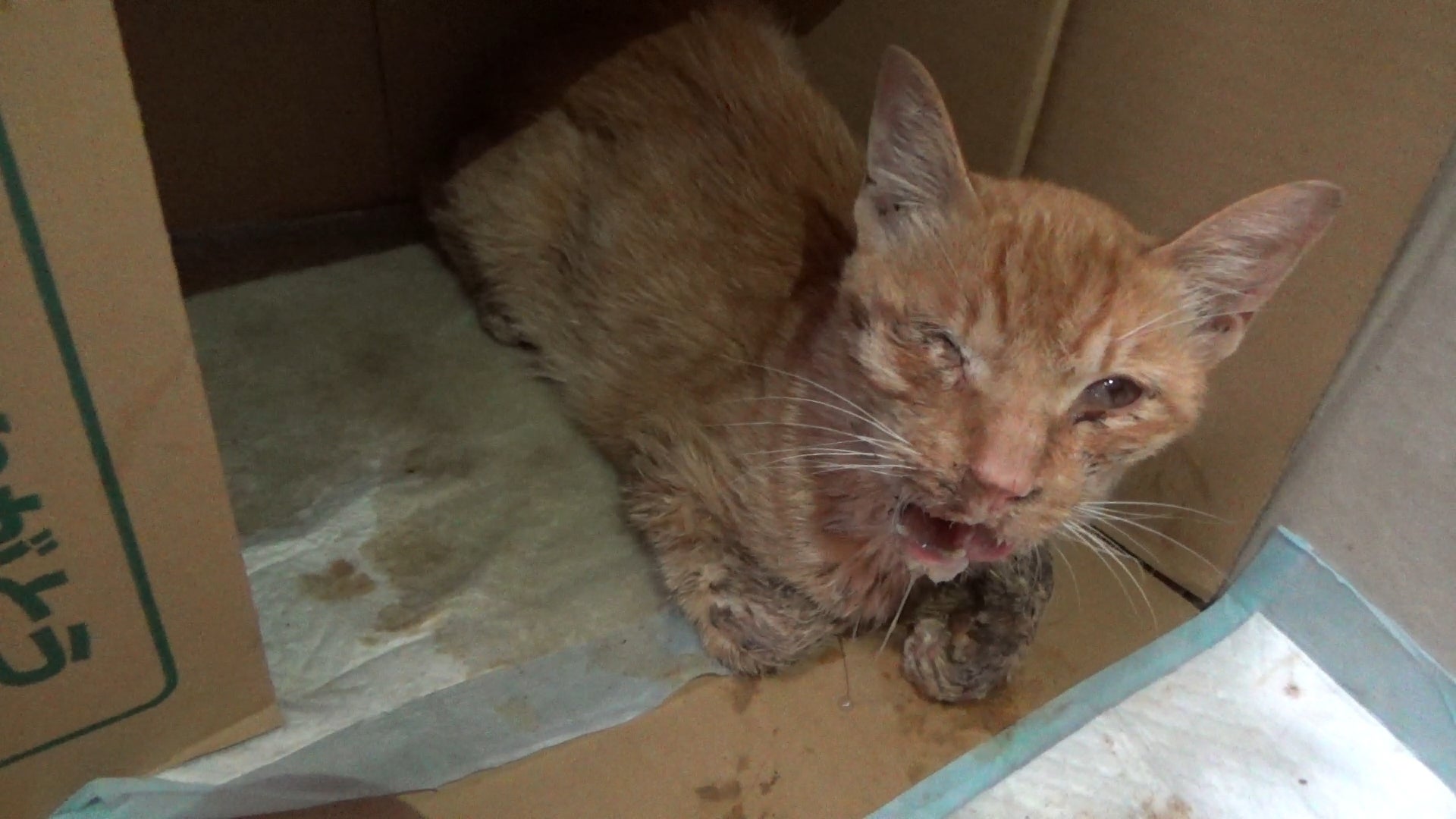 怪我の痛みや、アゴの骨の歪みで食事やお水が飲めず、かなり衰弱をした状態を保護いたしました。