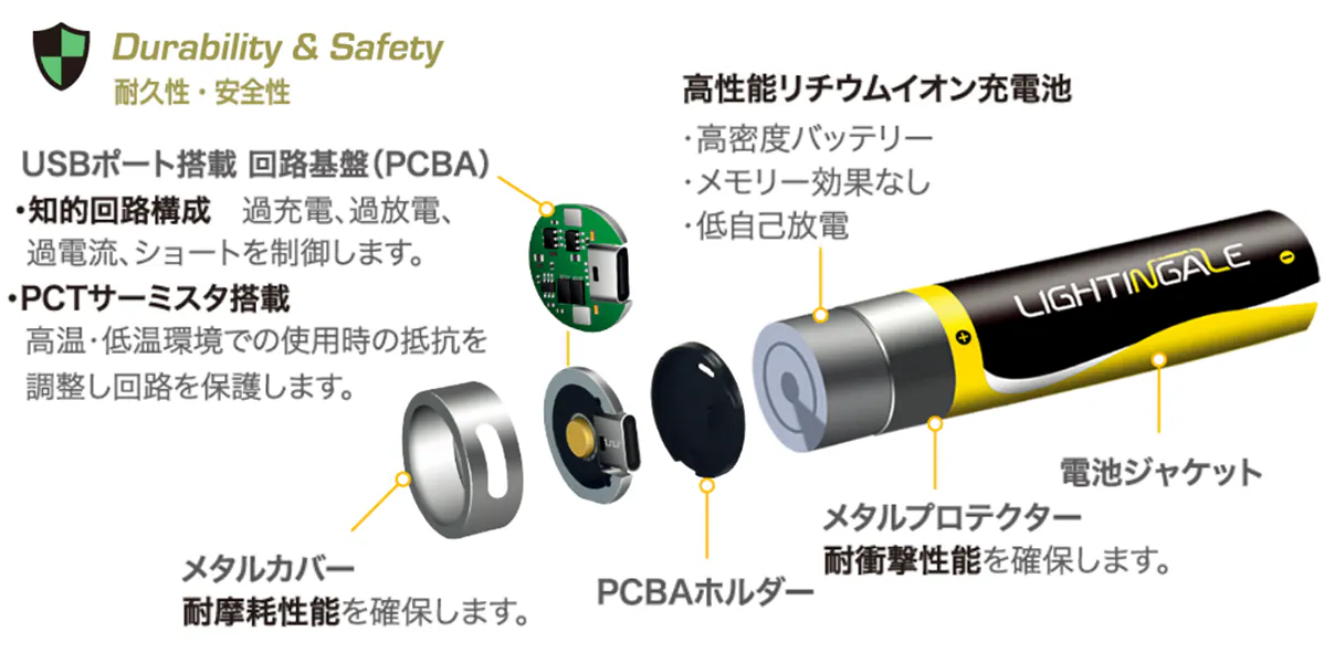 乾電池とUSBポートというなじみ深いデザインの融合は、独自の先進技術と最新のセルを用いて安心・安全にご使用いただけます。