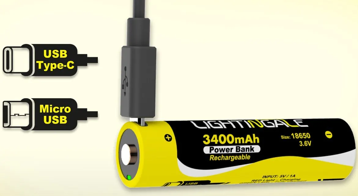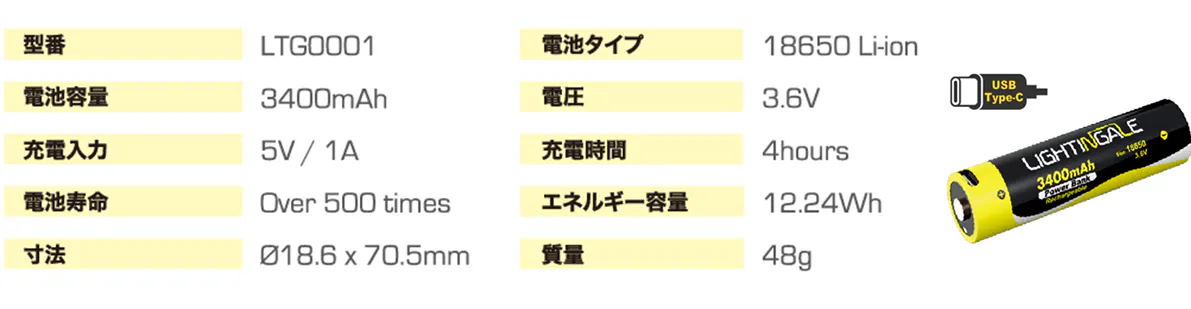 LEDライトやランタンなどに多く使用されている18650型と呼ばれる乾電池としても使用いただける3400mAhの大容量充電式バッテリー。