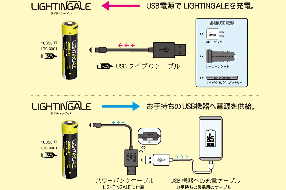 例えばLEDライトにせっとしておけば、いざという時のスマホ充電用のバッテリーにもなります。また、バッテリーにUSB type-Cポートを備えているので、どこでも簡単に充電可能です。電池の型が合えば様々な機器にご利用いただけます。