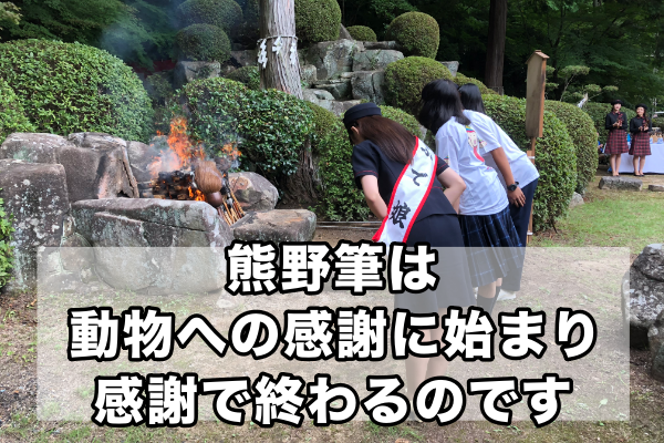 毎年筆まつりで行われる「筆供養」では、筆づくりのため毛を提供してくれた動物たちへの感謝と供養と、使い古されて役目を終えた筆にたいする感謝の気持ちをこめて、毎年何千本もの筆を神聖な火の中に投じる「筆供養」を行っています。