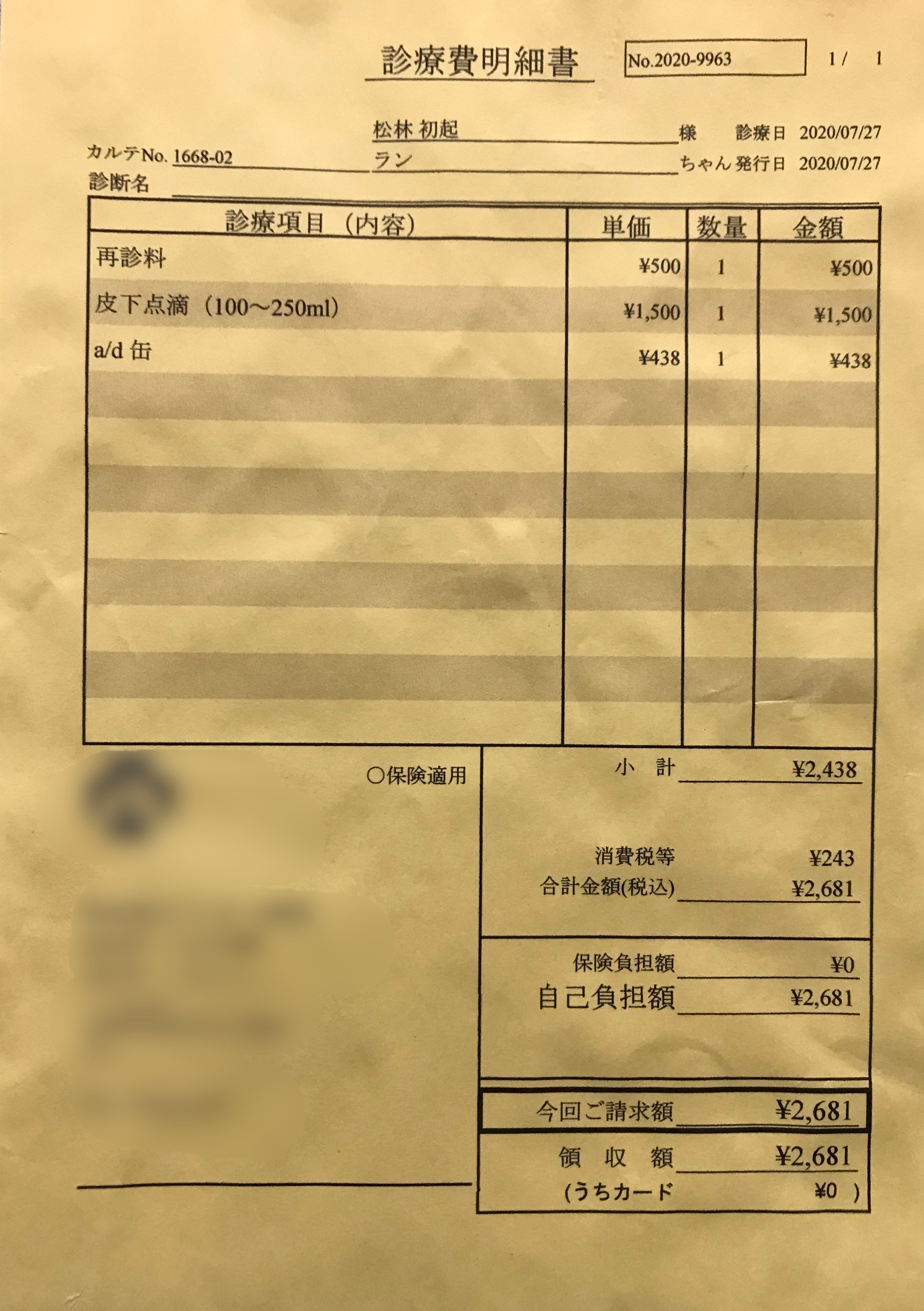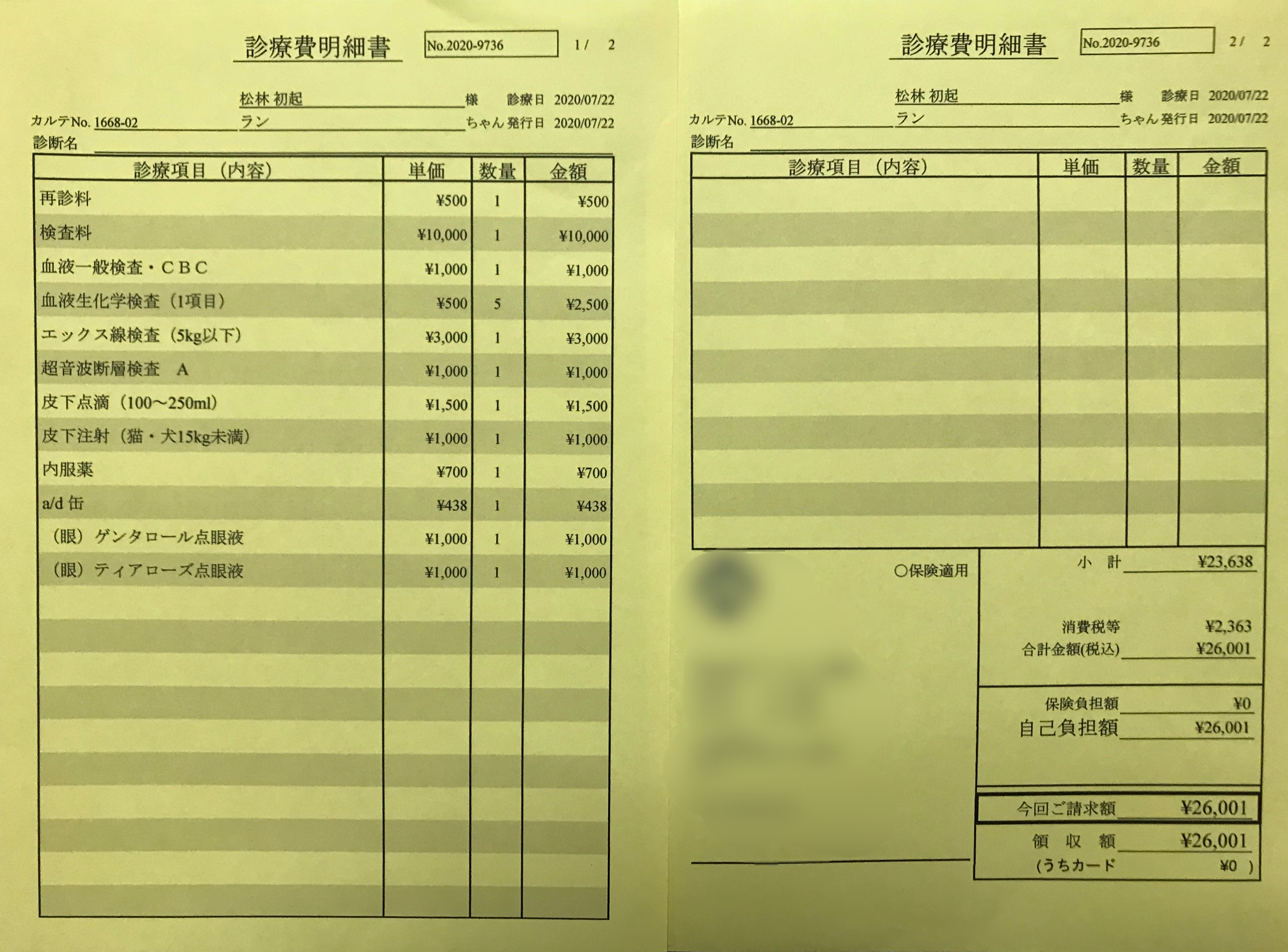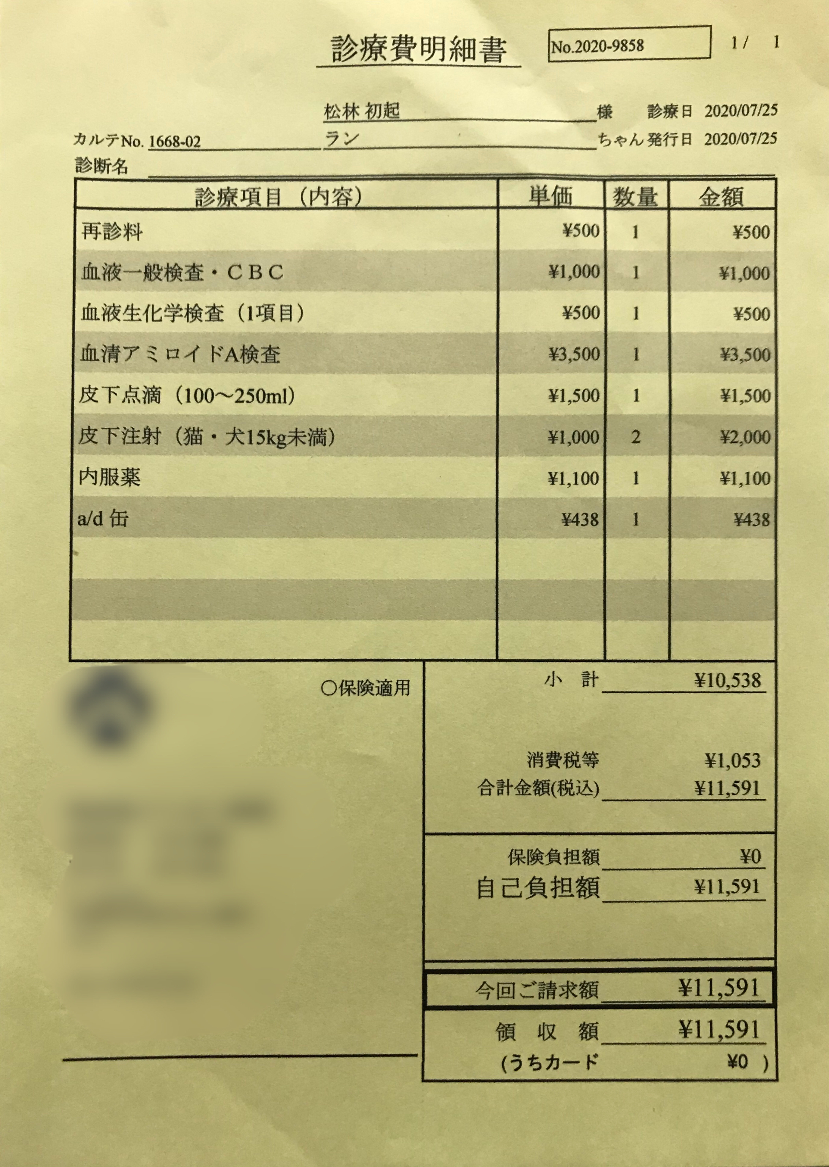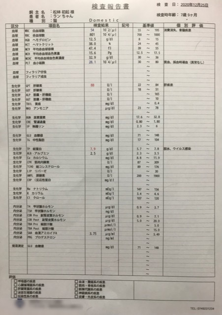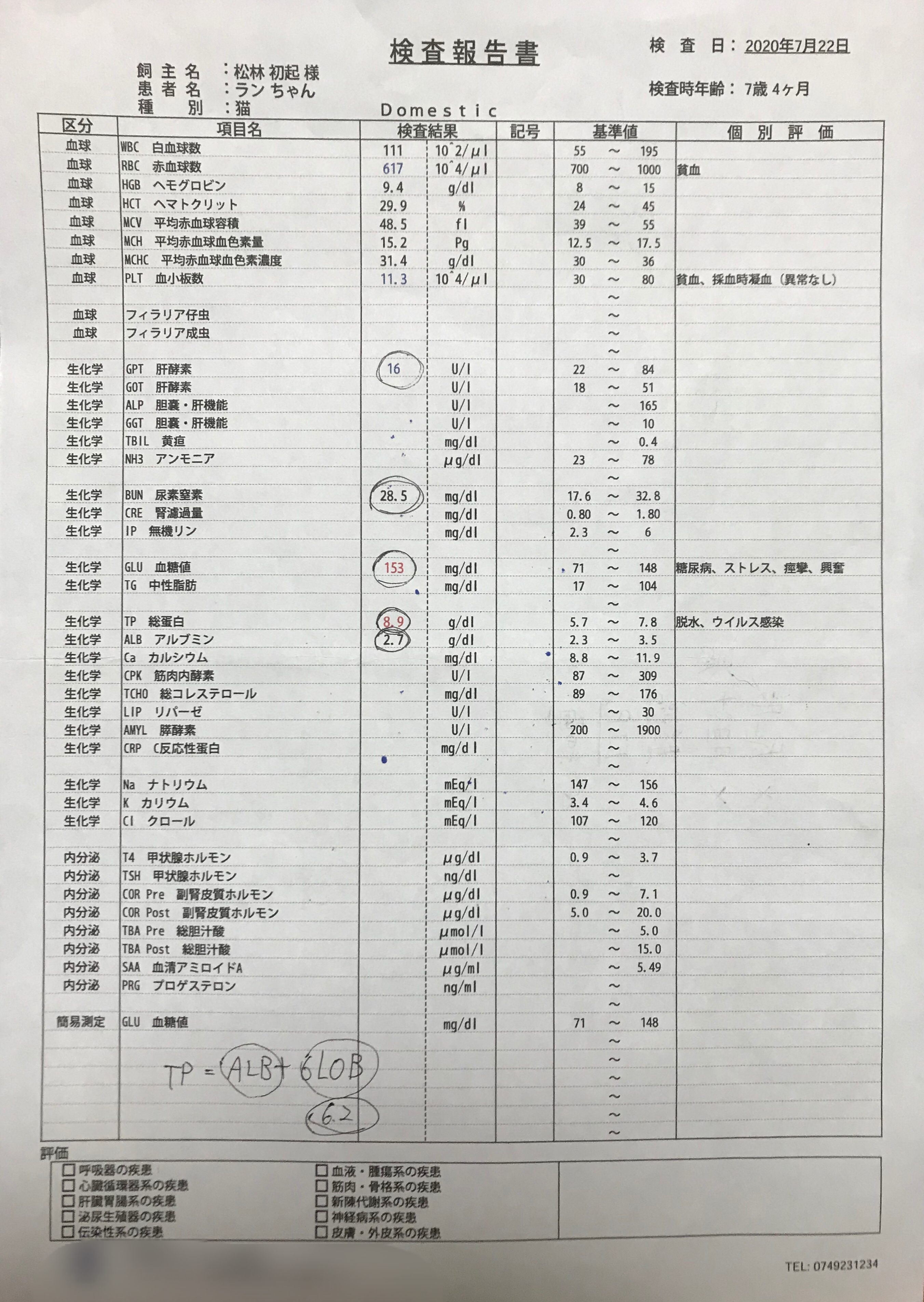今まで病気らしい病気もした事が無かったランが、2020年7月20日頃から食欲が無くなり、全く食べなくなり、7月22日に受診しました。