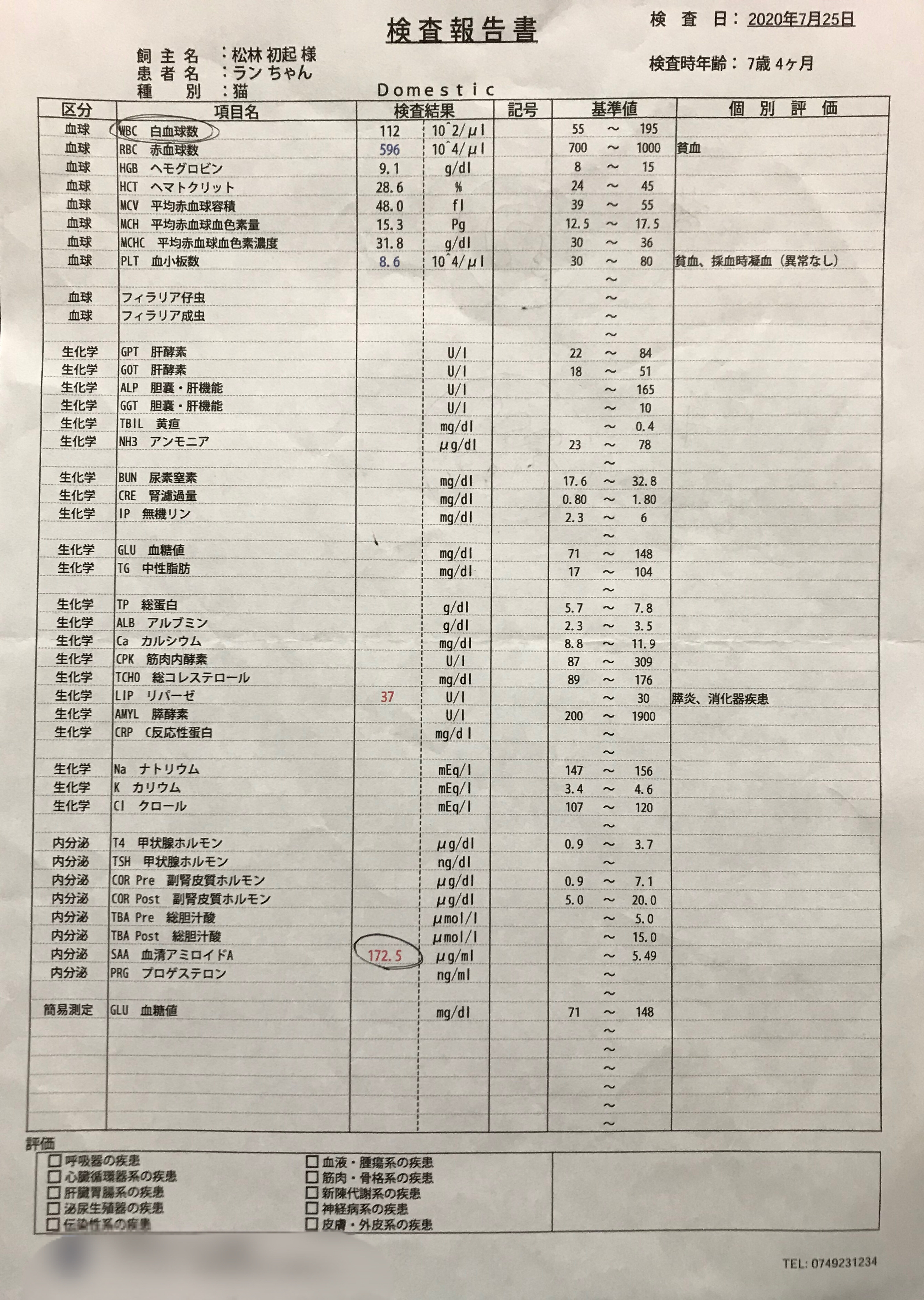 7月25日、再度血液検査、皮下点滴、皮下注射、抗生剤が変更されました。