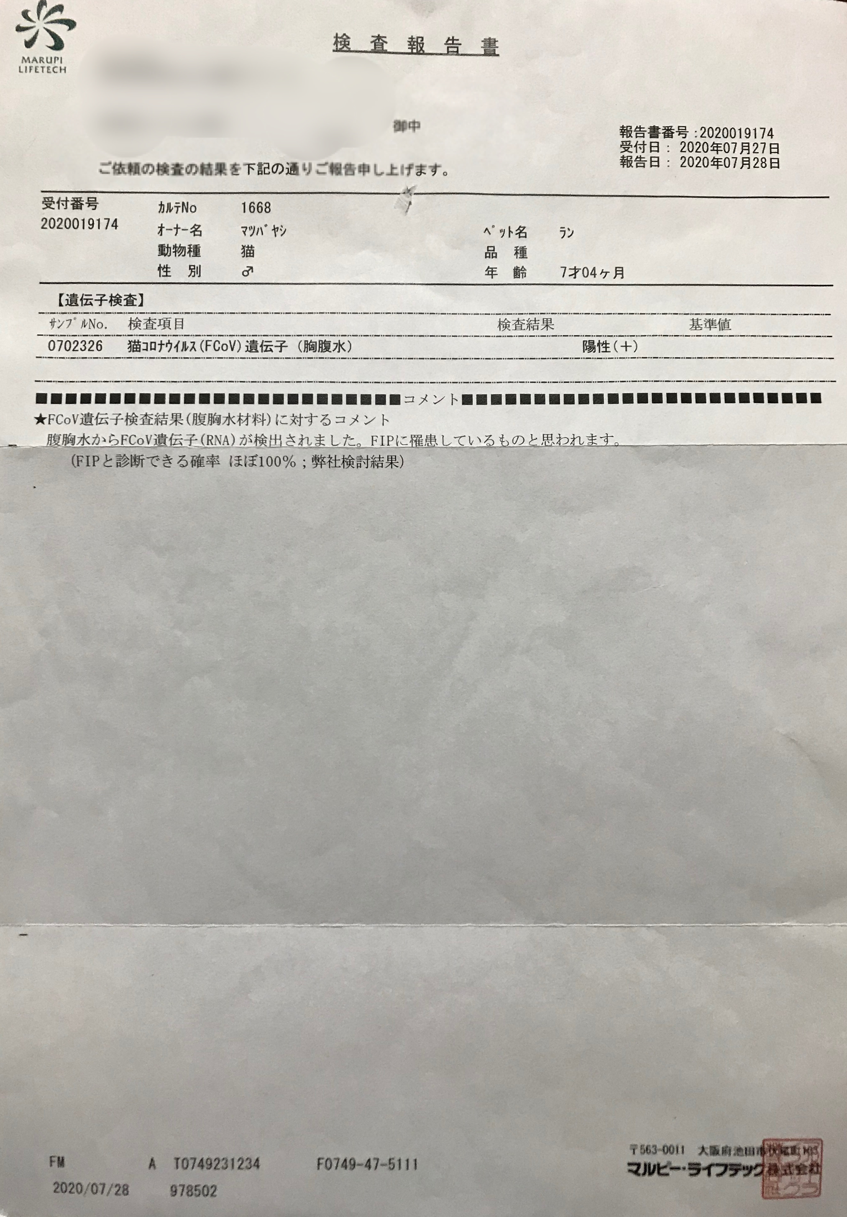 7月27日、依頼していた検体検査の報告書が届き、猫伝染性腹膜炎(FIP)ウエットタイプと診断されました。ステロイド剤、インターフェロンによる治療では、余命数日~数か月。所謂、延命治療に過ぎません。MUTIANの説明も受けましたが非常に高額で即答は出来ませんでした。
