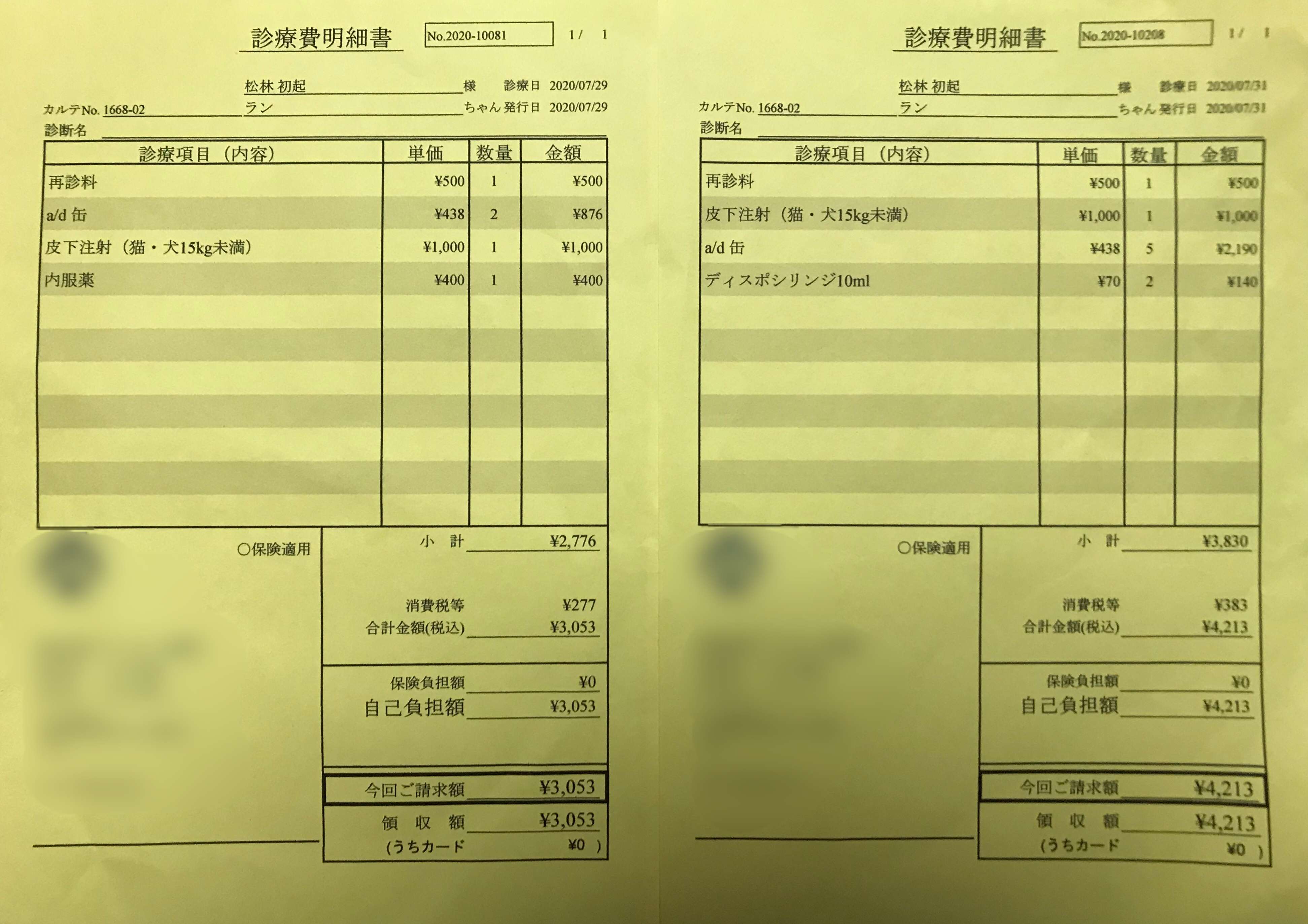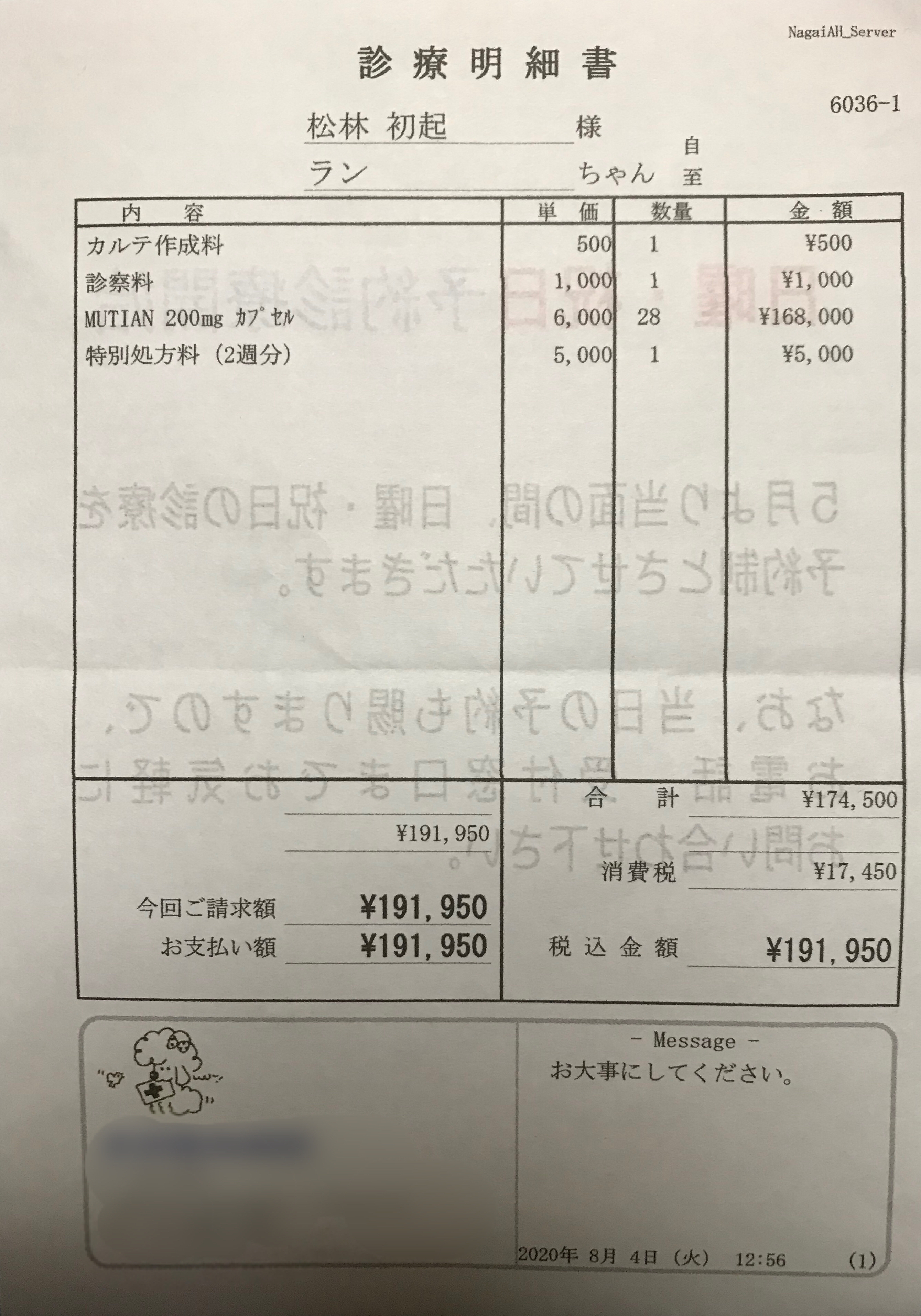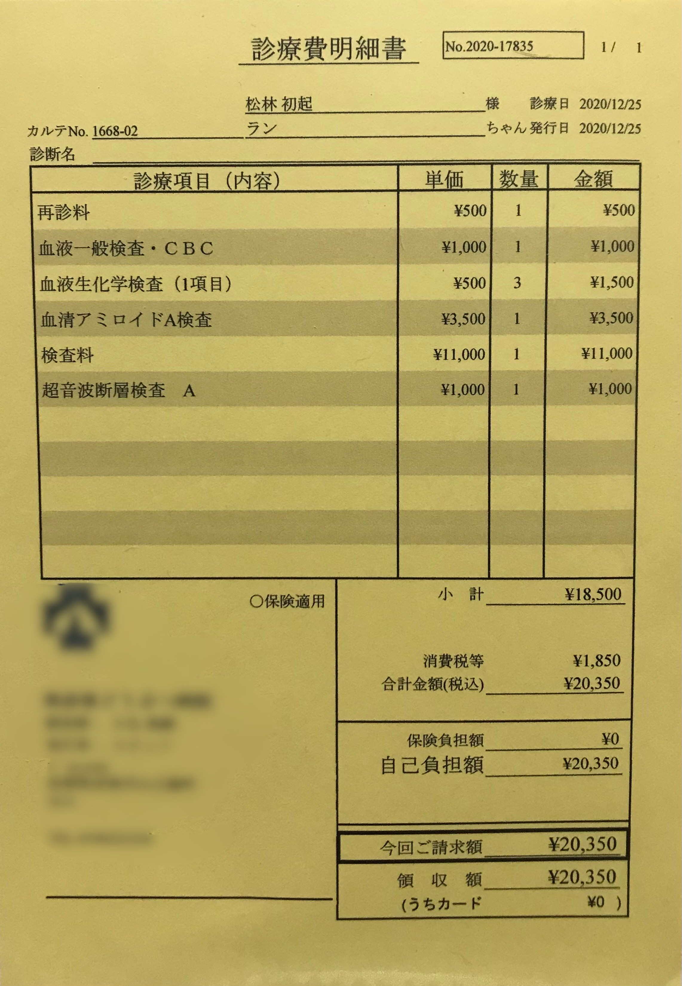 薬価も非常に高額で、ランの現体重で、1日当たり400㎎、14,000円。これを84日間投与します。定期的な経過を診る診察料、エコー検査、血液検査等を全額負担することは非常に厳しい状況です。