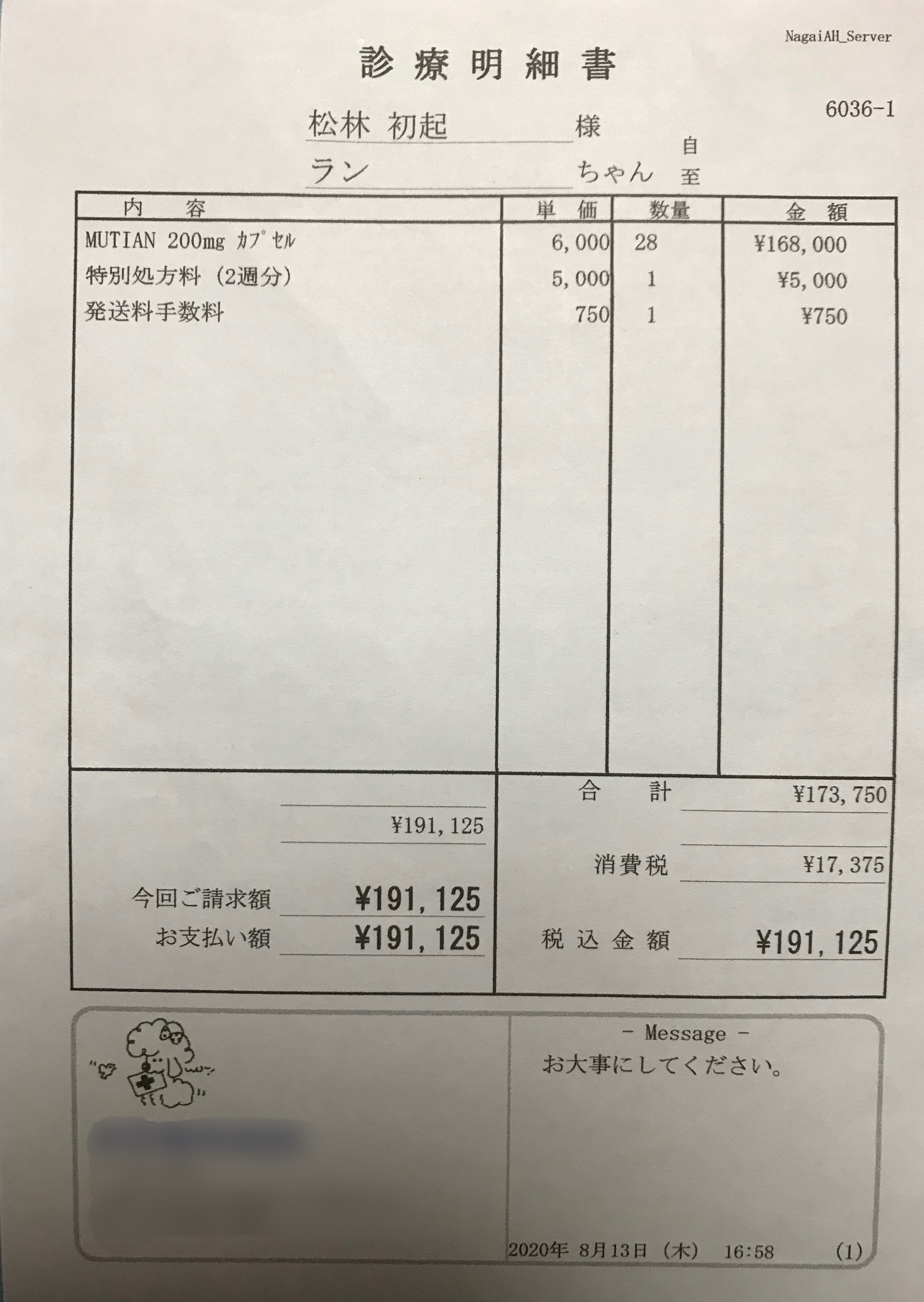 そして、8月4日、県外で一番近い、MUTIAN協力病院を受診し、治療を開始しました。