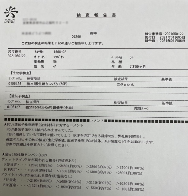 2021/01/07 10:052020年12月25日の経過検査の結果報告がありました。猫α1酸性糖タンパク(AGP)250μg/ml猫コロナウイルス(FCoV)遺伝子(全血)陰性でした。順調に回復し、今のところFIP再発も無さそうです。 もっと見る
