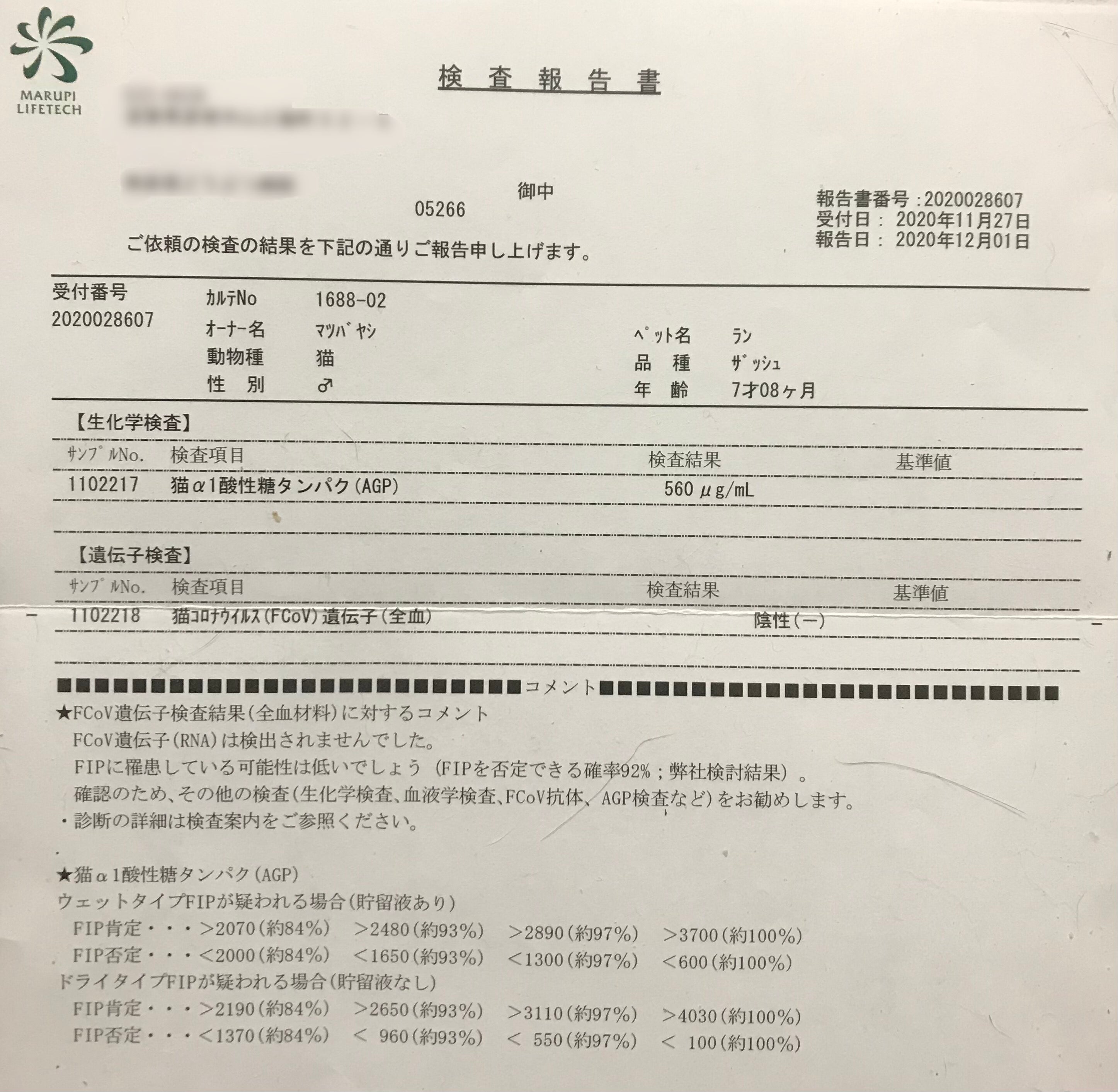 2020年12月25日の経過検査の結果報告がありました。猫α1酸性糖タンパク(AGP)250μg/ml猫コロナウイルス(FCoV)遺伝子(全血)陰性でした。順調に回復し、今のところFIP再発も無さそうです。