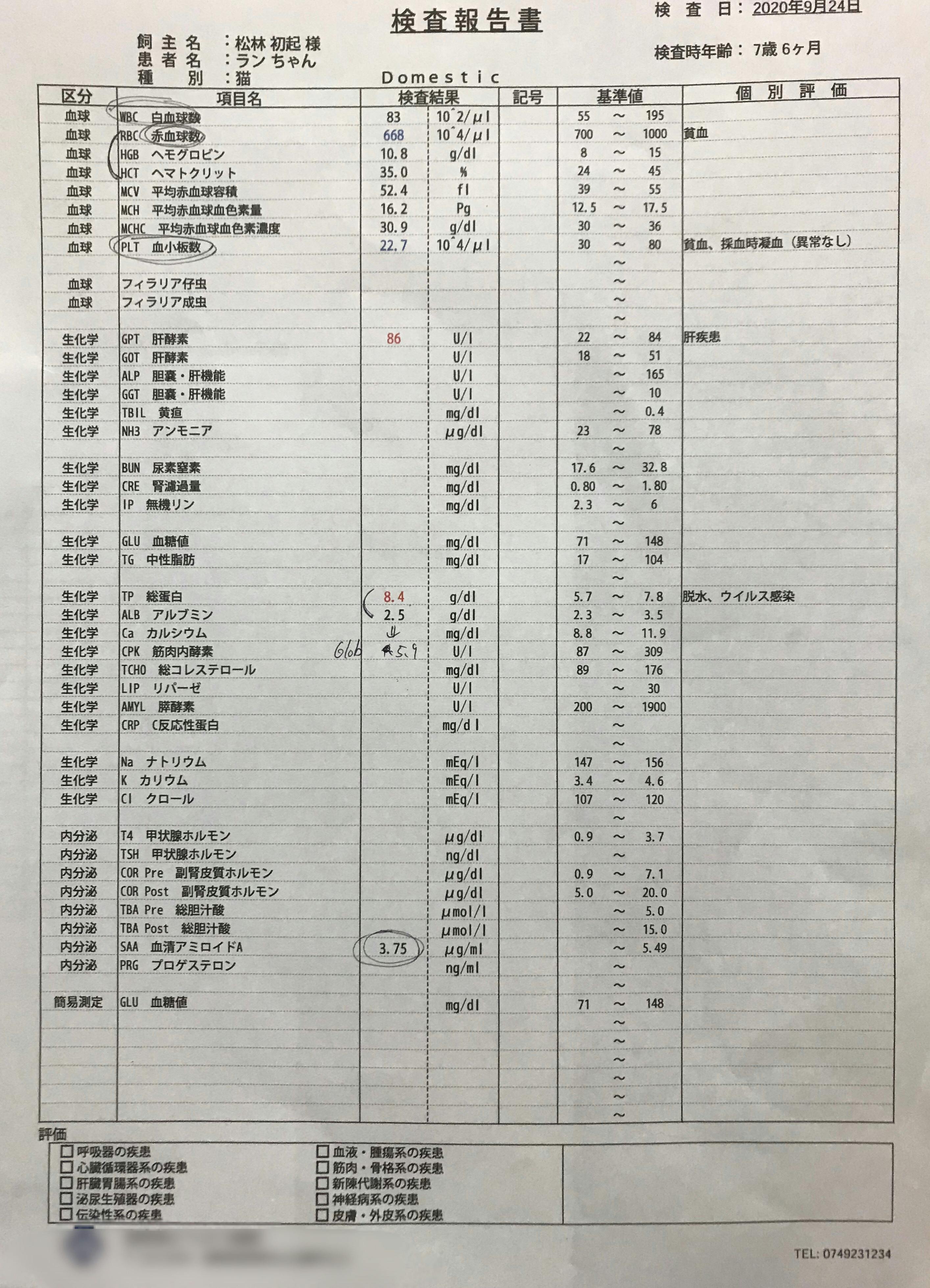 全血でFCoV、α1AGは外注検査の為、結果に一週間ほどかかるとの事で、また改めて報告致します