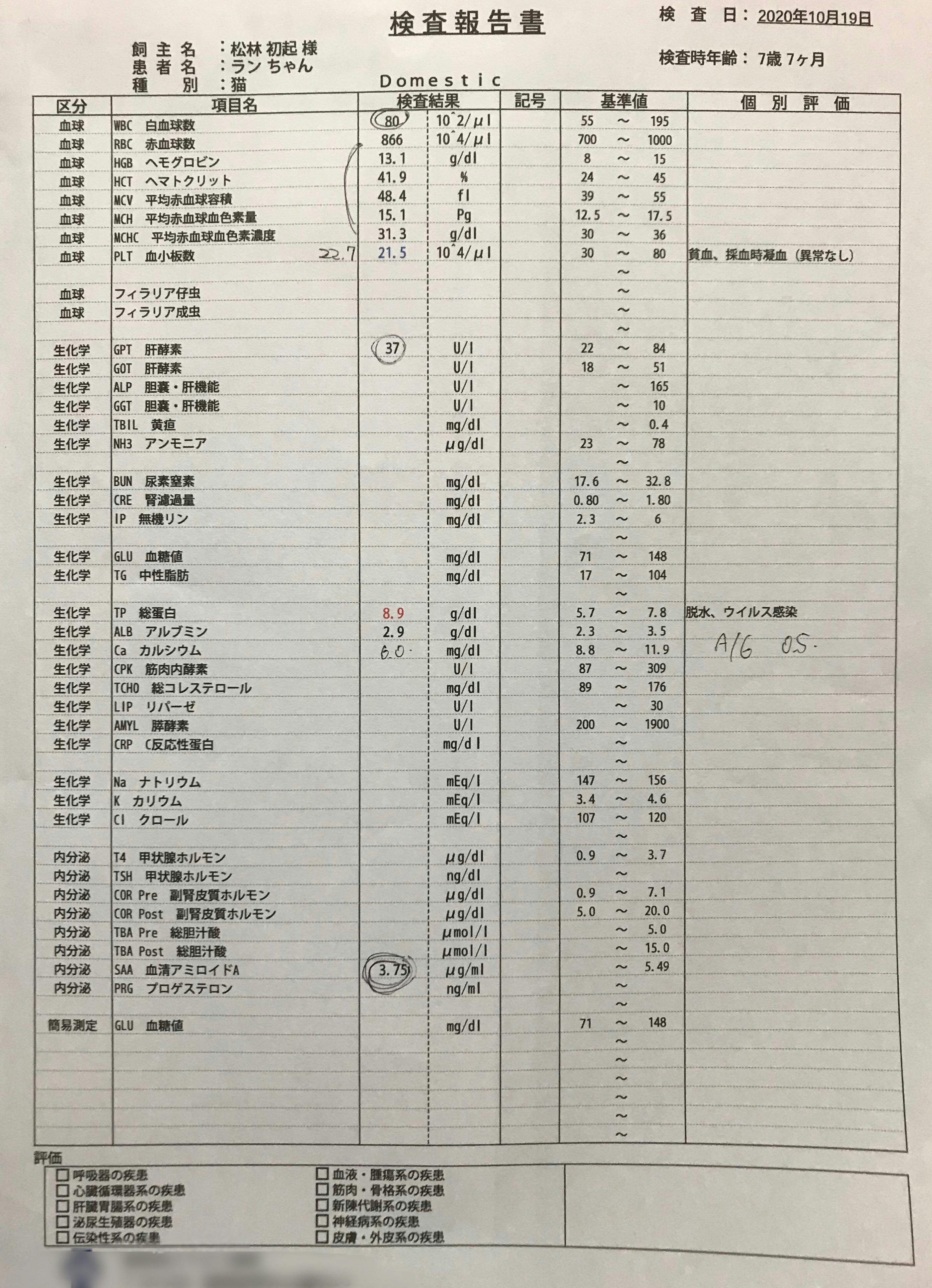 全血でFCoV、α1AGは外注検査の為、結果に一週間ほどかかるとの事で、また改めて報告致します