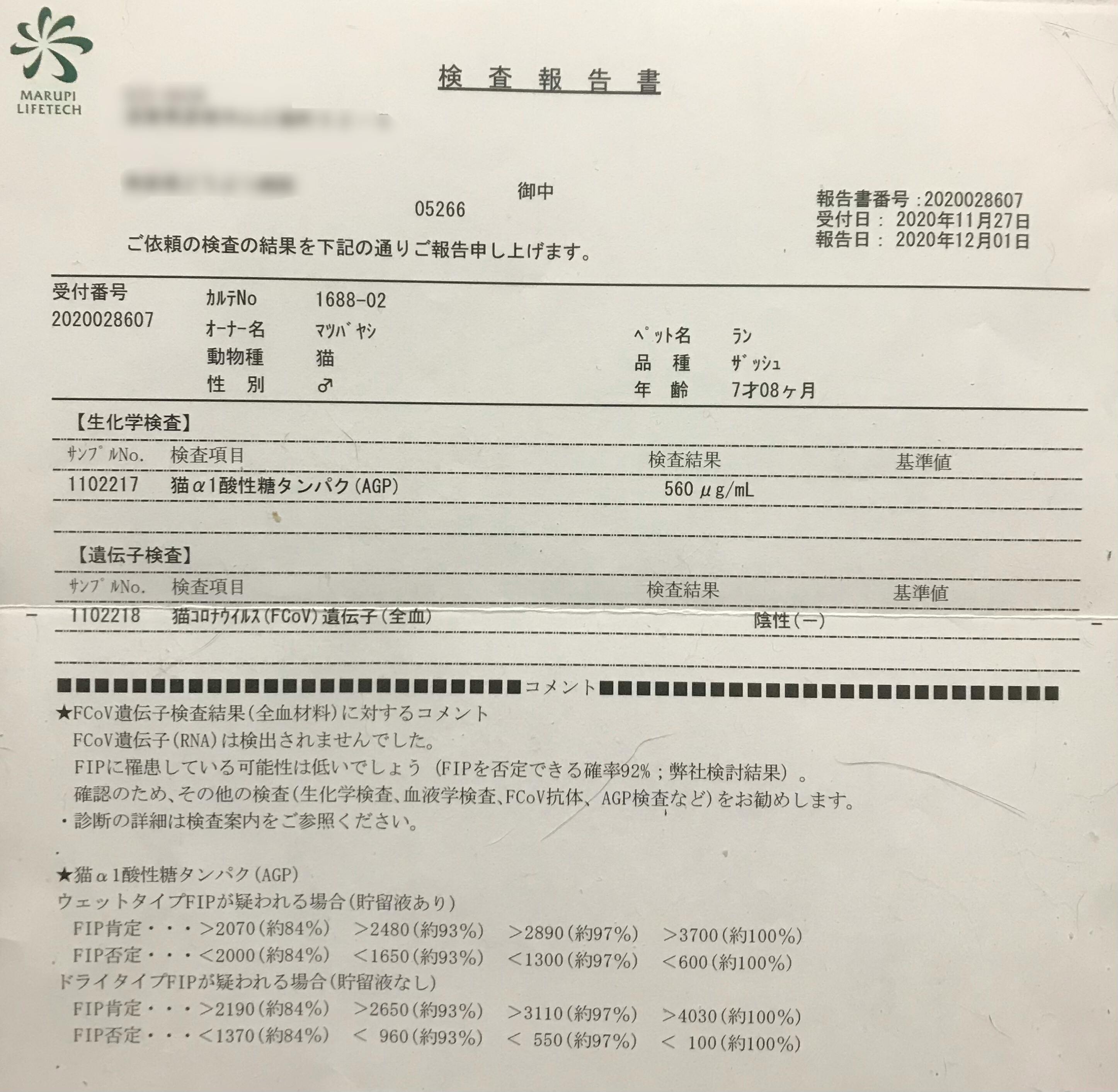 猫コロナウイルス(FCoV)遺伝子(全血)陰性