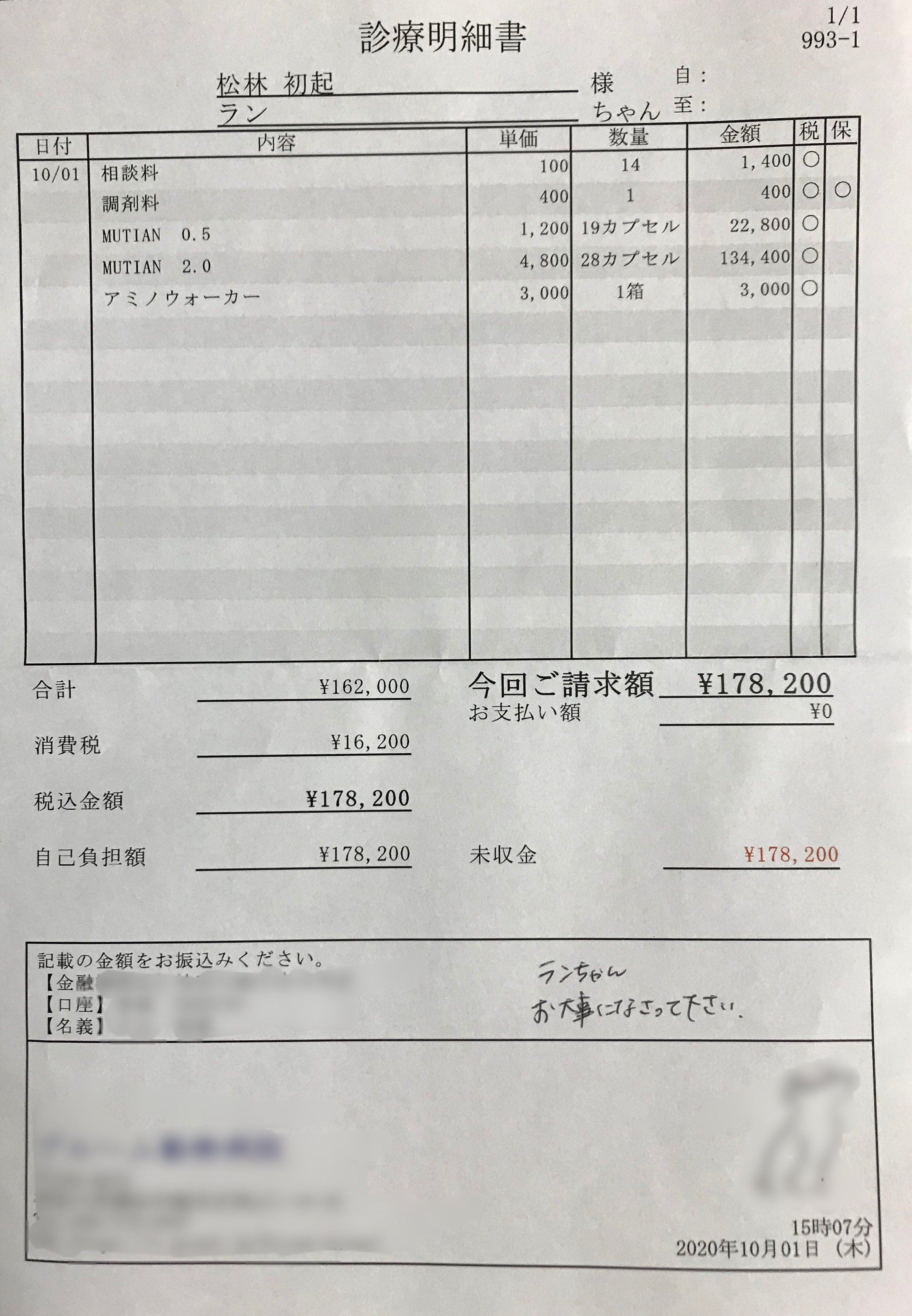 MUTIANと、プロテイン、アミノウォーカーの診療明細書を報告致します。