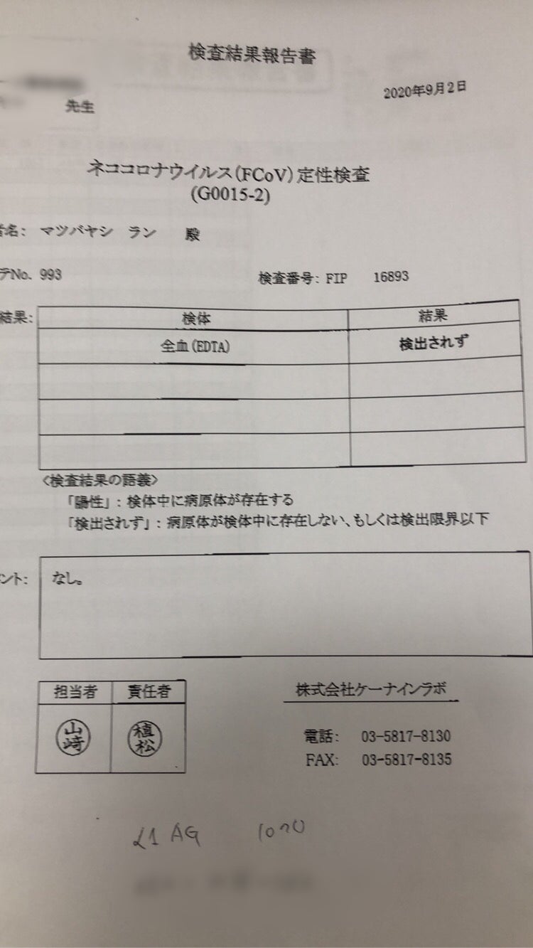 8月31日に実施しました、ネココロナウイルス(FCoV)定性検査の結果がでました。結果 「検出されず」治療経過は順調です。