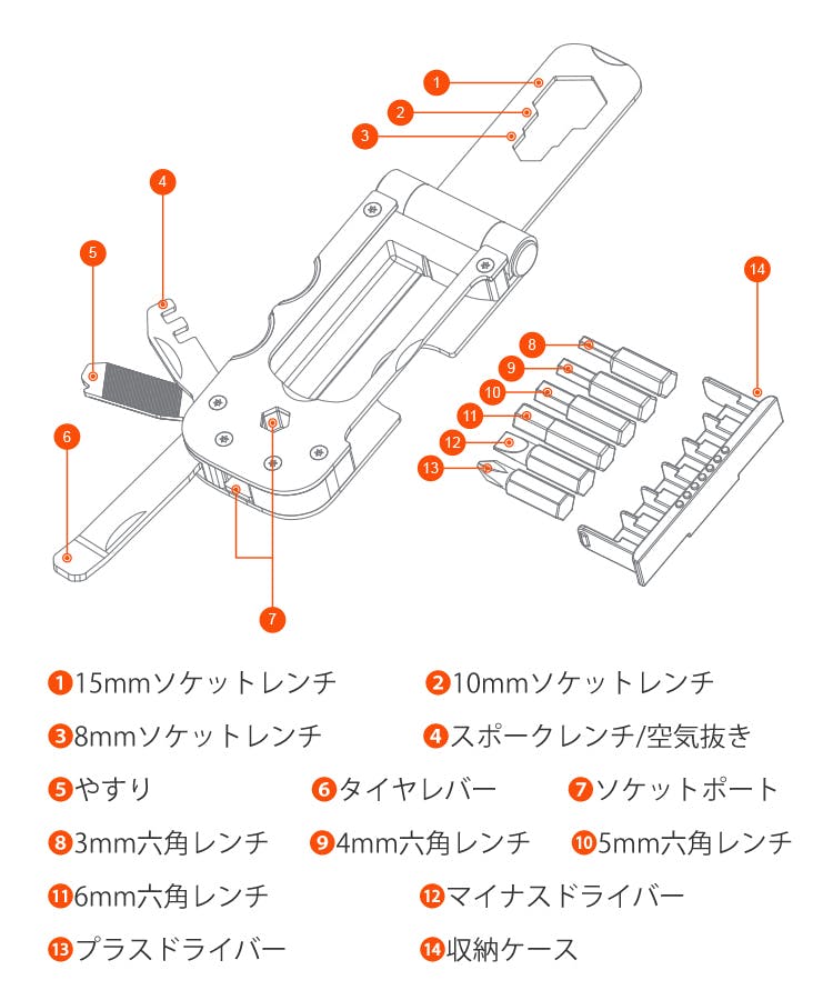 A.15mmソケットレンチ、10mmソケットレンチ、8mmソケットレンチ、13Gスポークレンチ、14Gスポークレンチ、空気抜き、やすり、タイヤレバー、3mm六角レンチ、4mm六角レンチ、5mm六角レンチ、6mm六角レンチ、プラスドライバー、マイナスドライバーの合計14ツールを搭載しています。