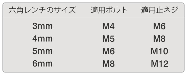 六角穴付きボルトや六角穴付き止めネジの締緩に使用する六角レンチ。3mm・4mm・5mm・6mmの4サイズが搭載し、幅広いボルトやネジに対応。ヘキサゴンレンチ、ヘックスと呼ばれることもあります。