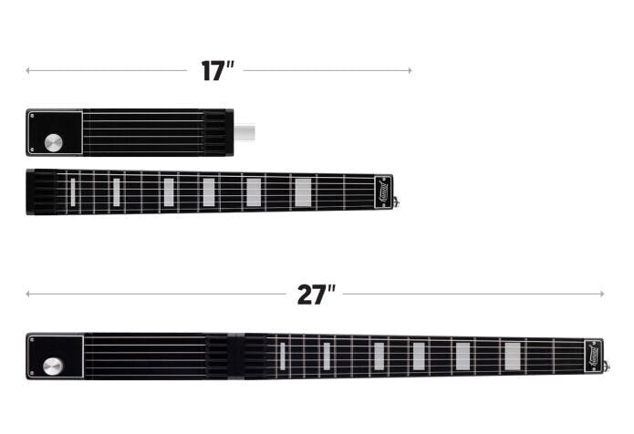 Jammyはどこへでも持ち運べるデジタルトラベルギターです。分解時はわずか17inch(約43cm)、組み立て時は27inch(約68cm)で、非常にポータブルで、バックパックに簡単に収まります。