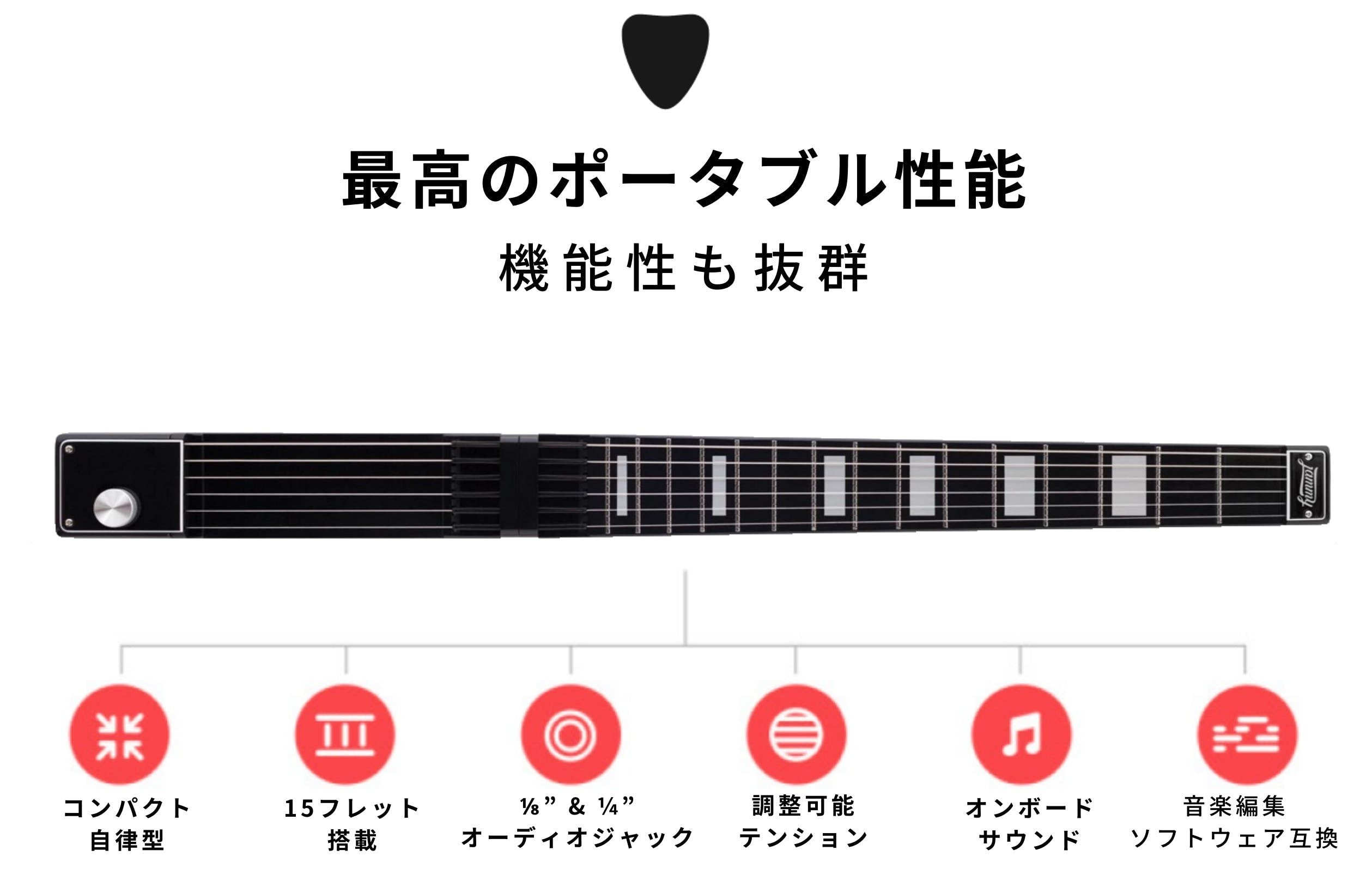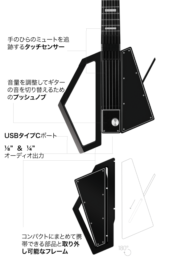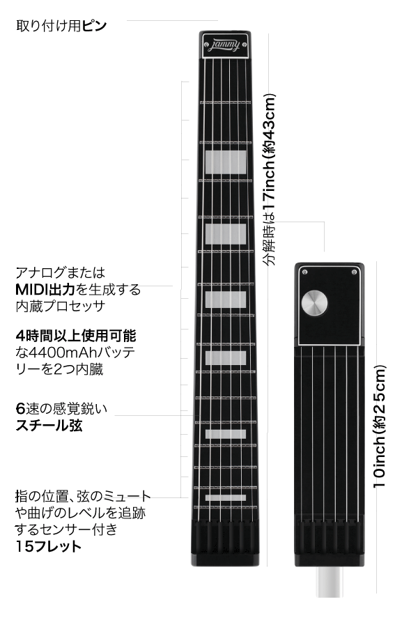 Jammy –オンボードサウンドのバックパックサイズのMIDIギターです。 ジャミーは本物のスチール弦で15フレットを搭載。 ユニークなモジュール構造と取り外し可能なネックにより、持ち運びに便利です。