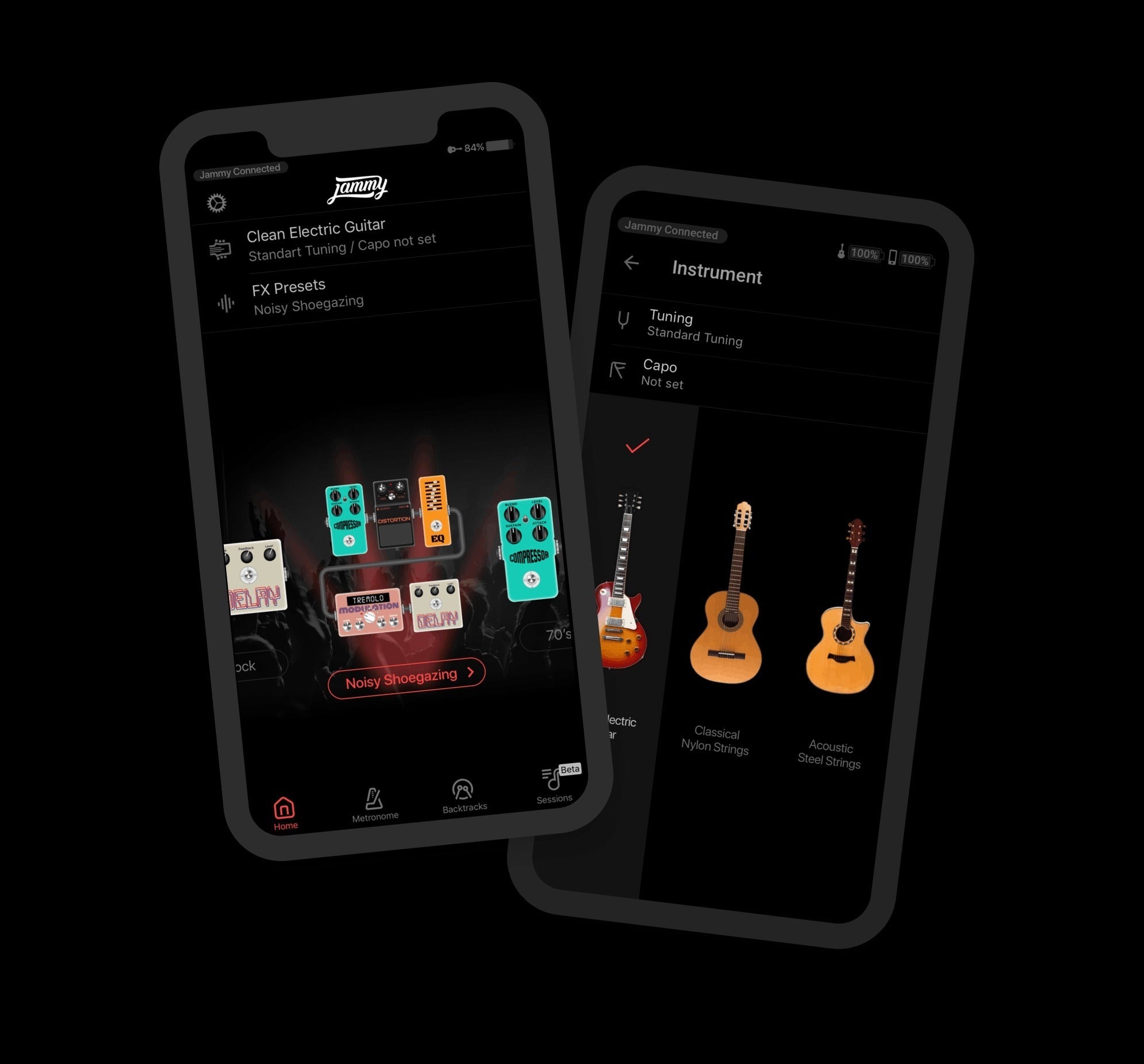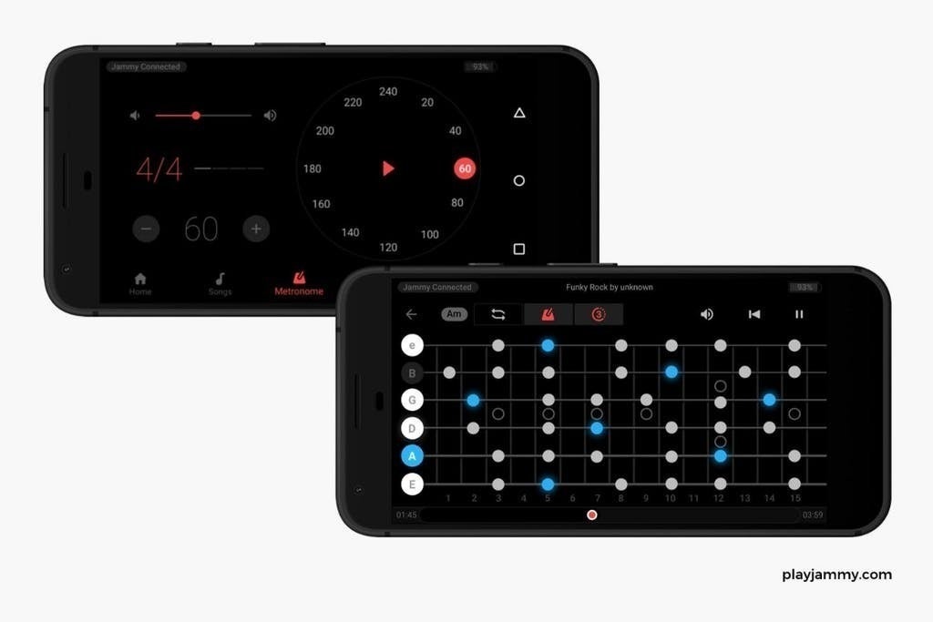 JammyのiOSおよびAndroid互換のモバイルアプリを使用すると、メトロノームの使用やギターのタイプの切り替え、チューニングの変更、FXパラメーターを調整したり、FXチェーンを構成して理想のサウンドを実現できます。 また、さまざまなジャンルのバッキングトラックに合わせた演奏が可能です。