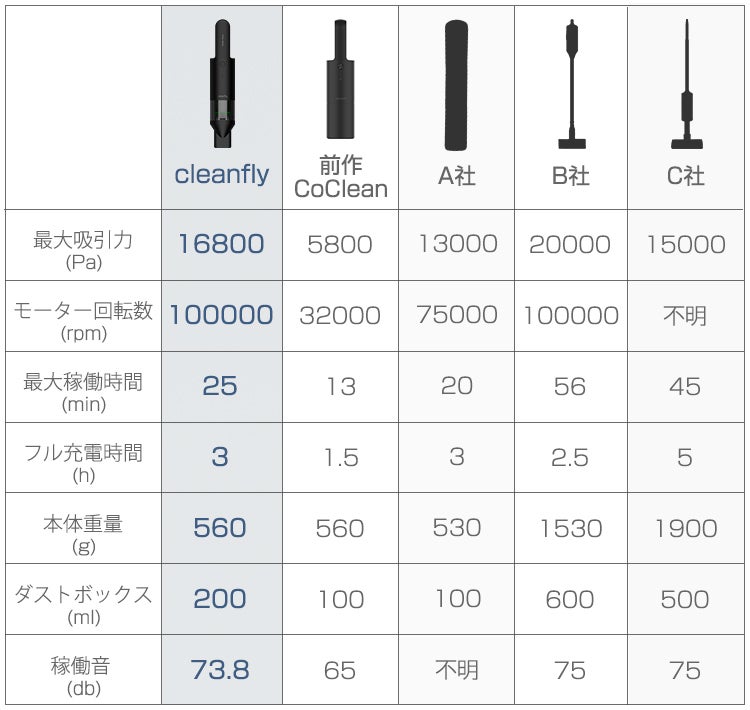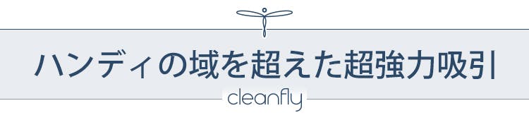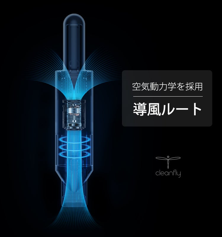 「cleanfly」は今までの常識を覆す、圧倒的なハンディクリーナー。370mmにも満たないサイズ、わずか560gの小さなボディが繰り出す吸引力は驚きの16800Pa!内蔵されたモーターは、1分間に10万回転する桁違いのパワフルさ!!