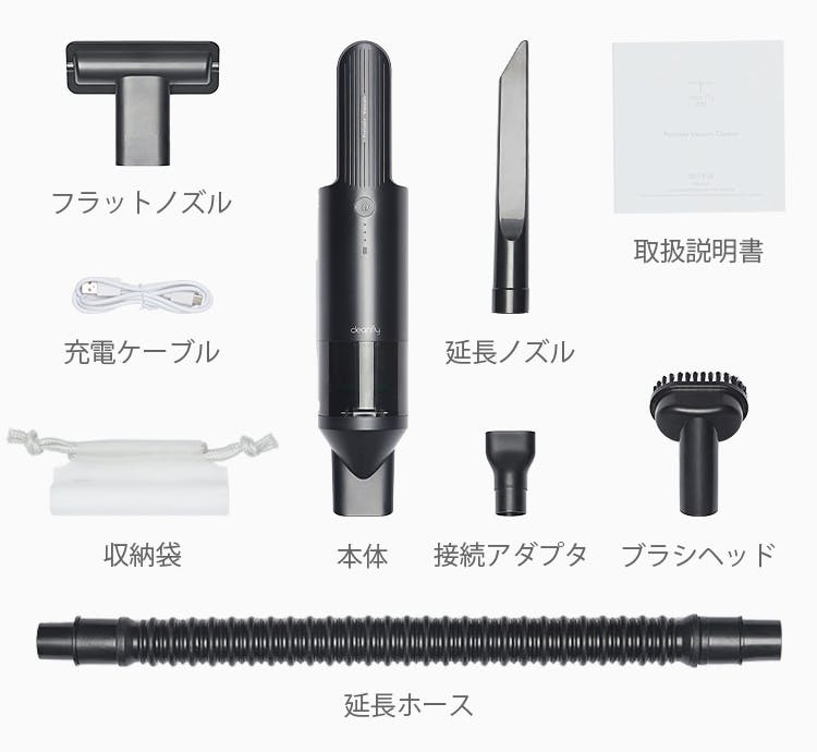 A.本体、フラットノズル、ブラシヘッド、接続アダプタ、延長ノズル、延長ホース、充電ケーブル、収納袋、取扱説明書が1セットに付き1つずつ付属します。「リターン&スケジュール」欄に詳細がございますのでご確認ください。