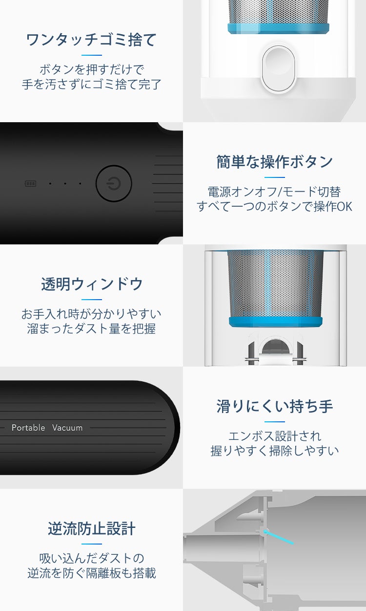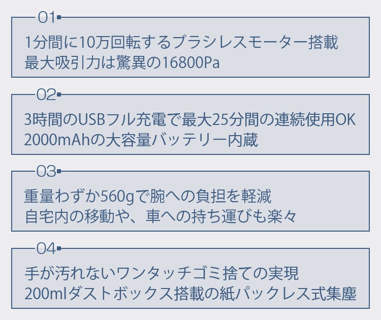 家庭用掃除機の約3分の1のコンパクトサイズでほぼ互角の吸引力を実現し、ハンディクリーナーとしては圧倒的な高スペック。