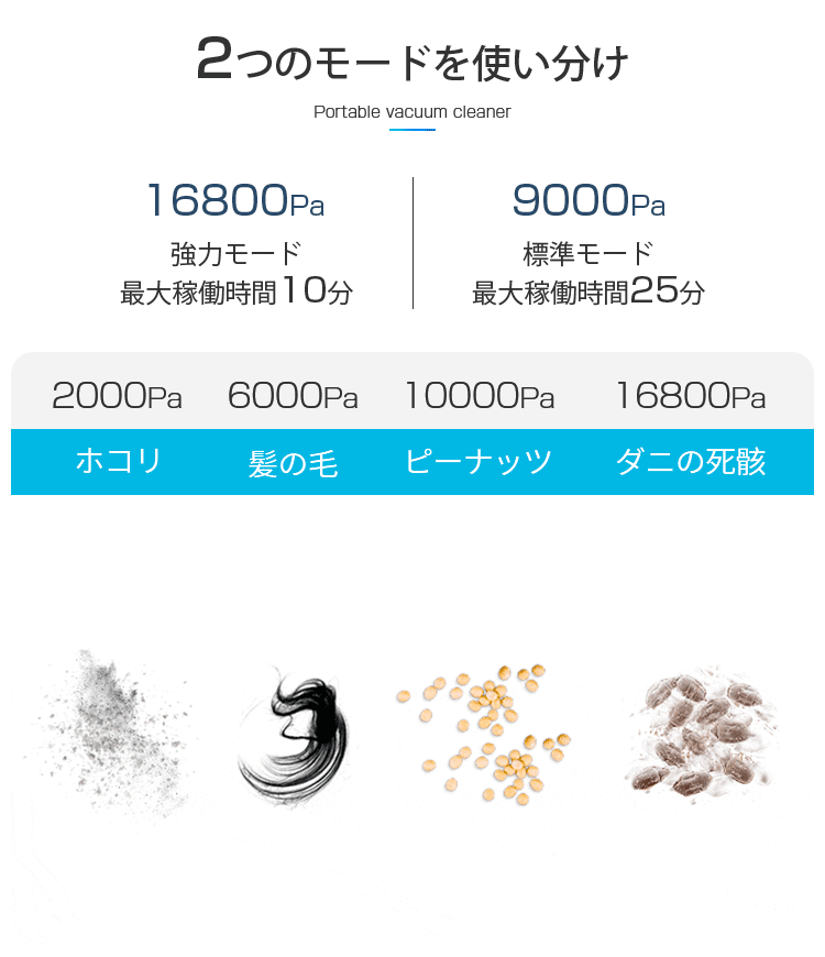 16800Paの強力モード(最大稼働時間約10分)は、例えばひどい汚れまでしっかり吸引したいシーンで。9000Paの標準モード(最大稼働時間約25分)は、おおきな空間を長めに掃除したいシーンや、食べこぼしをサッと吸引したいシーンで。