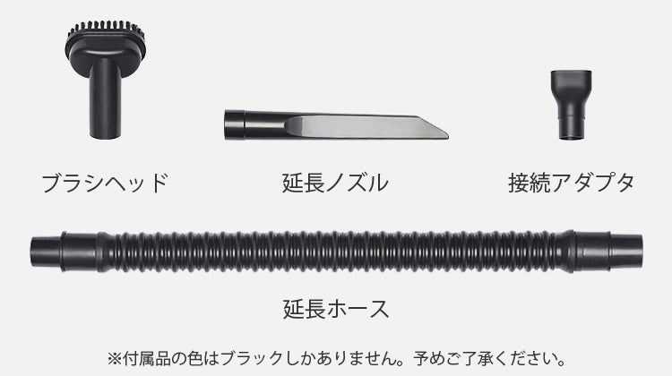 ▲1セットの内容(プレゼントパーツのブラシヘッド・接続アダプタ・延長ノズル・延長ホースはブラックのみのご用意です。)