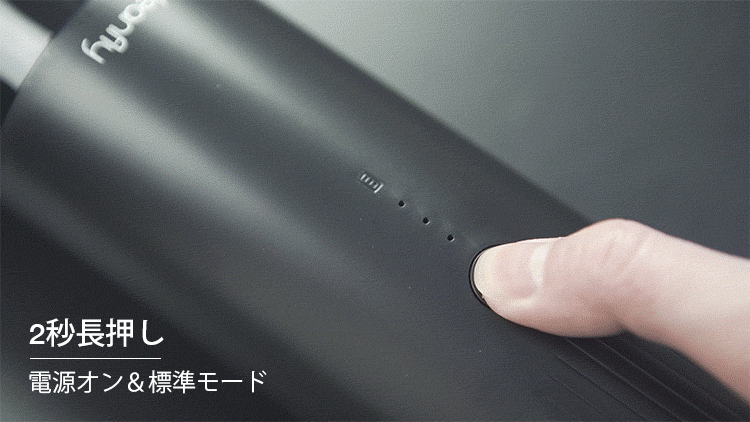 2秒間の長押しで電源オン/オフの操作ができ、電源オン時のデフォルトは標準モードです。電源が入った状態で1回クリックすると強力モードに切り替えられます。