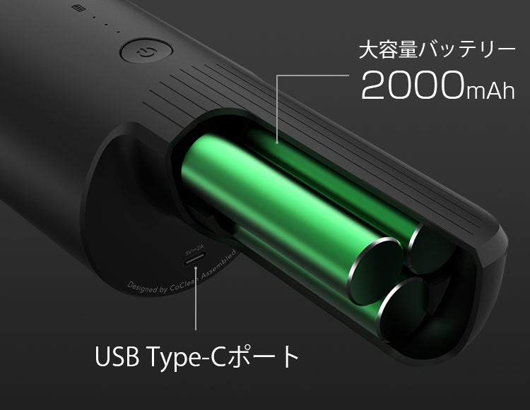 持ち手部分には3つのリチウム電池からなる、大容量2000mAhバッテリーがコンパクトに内蔵されています。