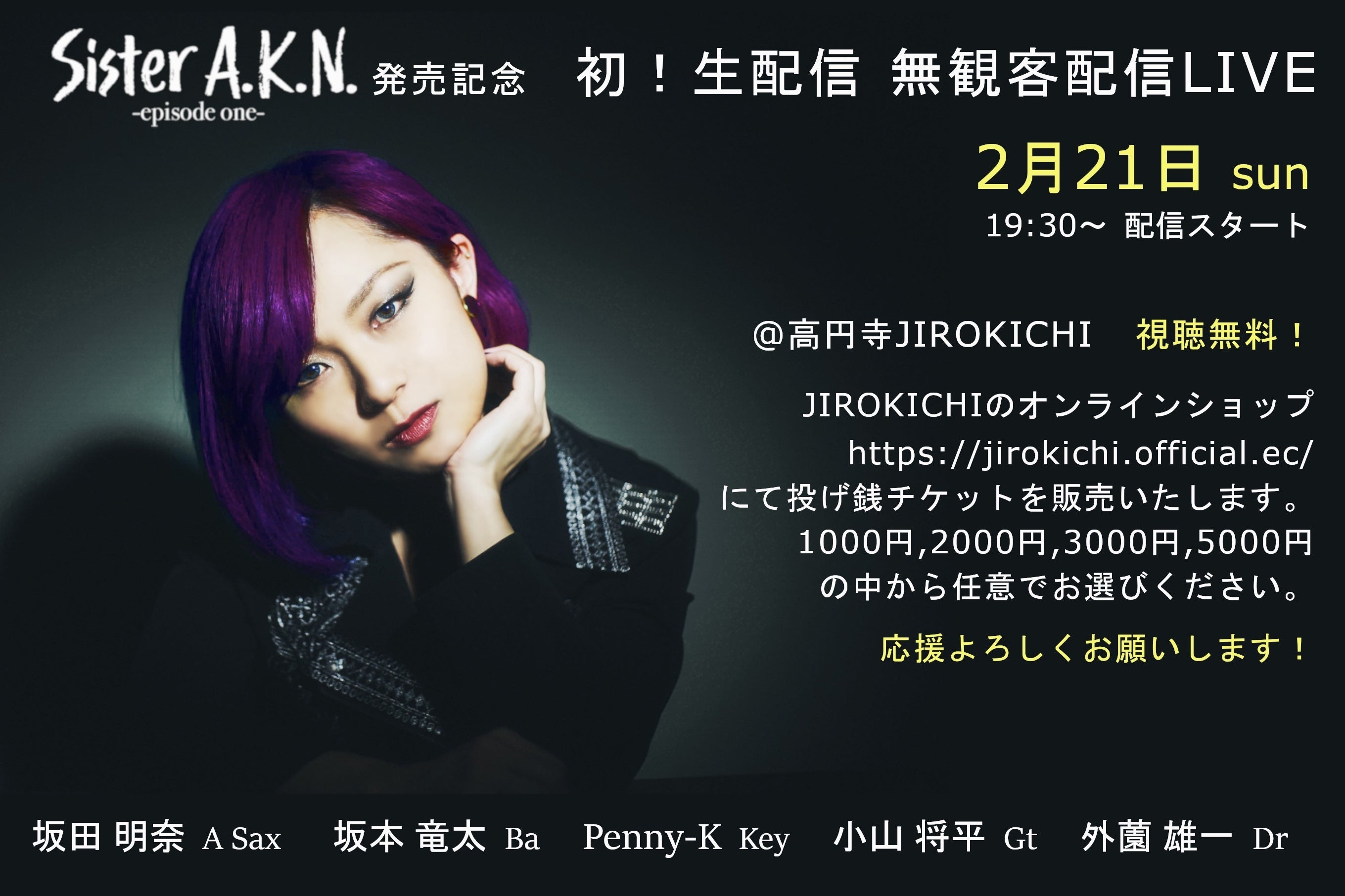 2/21(日)「Sister A.K.N. -episode one-」発売記念 初!生配信 無観客配信ライブが、急遽決まりました!!1月のレコ発ライブ、2月の関西ツアーも延期することになってしまいましたが、楽しみにしてくださっていた皆さま、いつも応援してくださる皆さまへ、感謝の気持ちを込めて、視聴無料の無観客配信ライブをします!!本当なら関西ツアー最終日の予定だった2/21(日)の19:30から、高円寺ジロキチより最高にファンクなステージをお届けします!!Jirokichiチャンネルにてご覧いただけます!https://www.youtube.com/c/LiveMusicJIROKICHI3日間無料で観れるのですが、ジロキチさんのオンラインショップにて、投げ銭チケットをご購入いただけます。https://jirokichi.official.ec/応援していただけたら、すごく嬉しいです!!よろしくお願いします!詳しくはこちら↓2/21(日)「Sister A.K.N. -episode one-」発売記念 初!生配信ライブ@高円寺ジロキチ 無観客配信ライブ坂田明奈 A Sax 坂本竜太 Ba Penny-K Key 小山将平 Gt 外薗雄一 Dr当日のライブは、YouTubeのJirokichiチャンネルhttps://www.youtube.com/c/LiveMusicJIROKICHIにて19:30から生配信をいたします。視聴自体はフリー(誰でも観られます)ですが、「後売りチケット」(投げ銭)をJIROKICHIのオンラインショップhttps://jirokichi.official.ec/にて販売いたします。1000円/2000円/3000円/5000円 の4種類とし、お客様に任意で選び購入していただきます。「後売りチケット」は、公演日当日~3日間販売されます。★投げ銭の仕方ライブ当日、YouTubeの画面下にある説明文にある、ジロキチのネットショップのサイト(https://jirokichi.official.ec/)をクリックしていただき、そこからアーティストの画像を選択、お気持ちで、数種類用意している画像から金額を選んでいただき、クレジットカードで購入していただくというイメージです。生放送終了後、翌日から三日間映像が残り、引き続き投げ銭もできます。クレジットカードをお持ちでない方は、スマフォのアプリ『バンドルカード』というのが便利です。セブンイレブンでチャージしてカードのように使えます。※投げ銭ができるのは、配信開始日~三日間です。※金額をお選びいただけます。※クレジットカードでしか購入できません。※後売りチケットを買っていただくことが投げ銭ということになります。