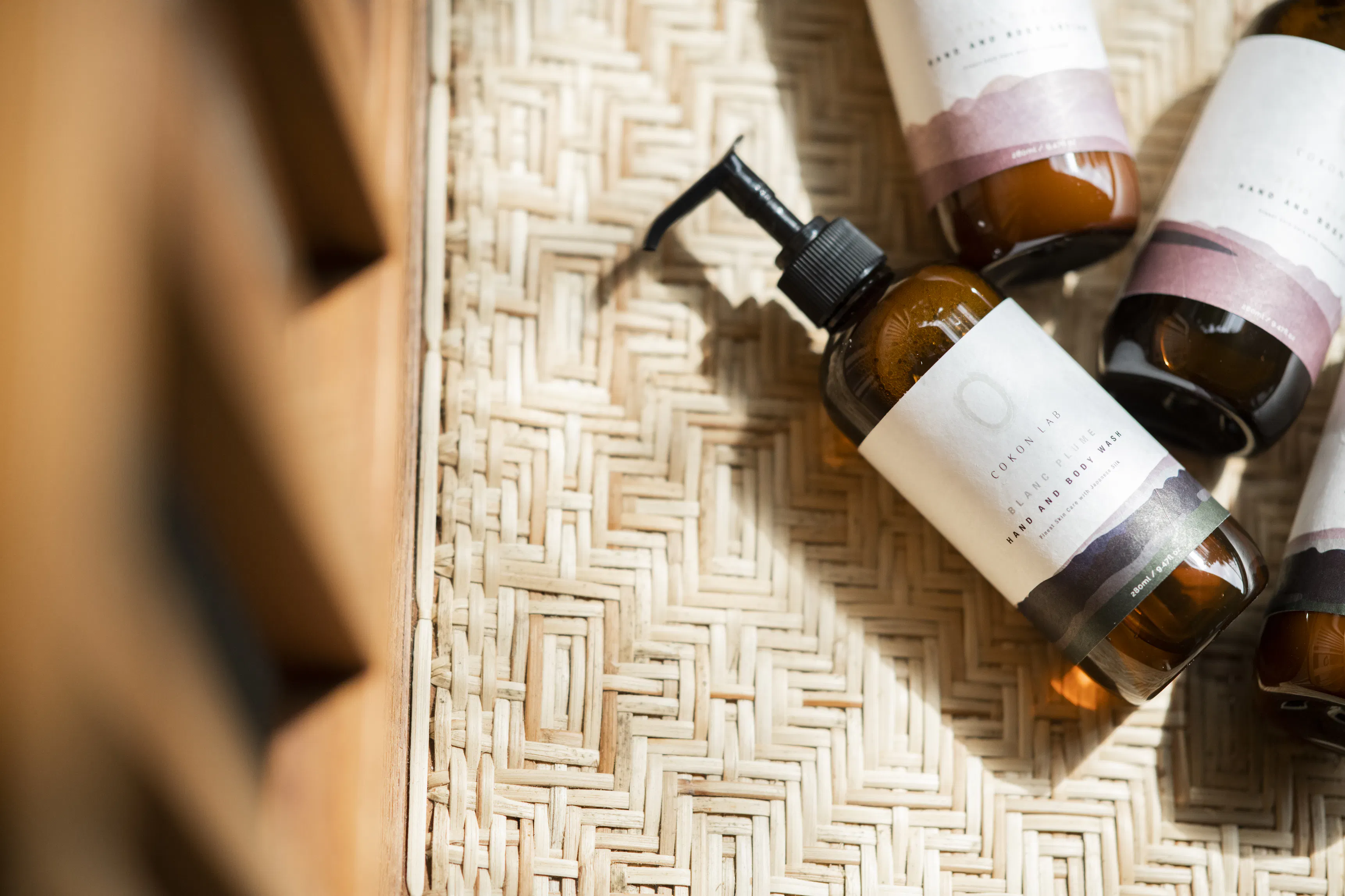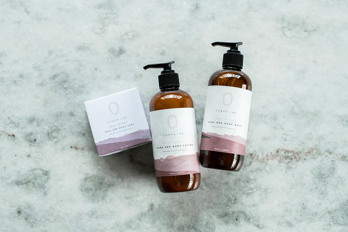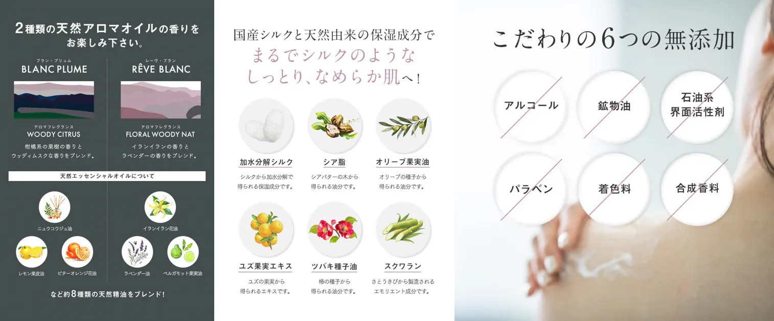 ウォッシュとローションには、より人の肌に馴染みやすいよう加水分解加工を施して配合しています。固形石鹸にはシルクパウダーを配合し、100%ナチュラル成分で仕上げています。