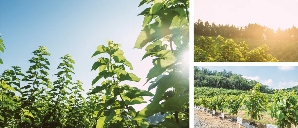それは、山鹿市内の耕作放棄地、遊休農地をひとつでも多く再生し、優良農地として甦らせること。さらに、農薬の影響を非常に強く受ける養蚕業において、平地から桑園まで遠く離れていることで殆ど農薬の影響を受けずに、カイコに優しいオーガニックな桑の葉を育てる事が可能なためです。平成28年7月時点、桑園面積約25ヘクタールのうち約9割の造成地に8万本の桑苗の作付けが完了。この「天空桑園」の土壌や気候など様々な条件を考慮し、桑の品種には『はやてさかり』を選定しました。