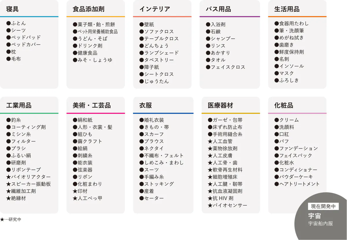 用途で言えば、繊維にとどまらず、食品から医薬品、自動車のパーツまでシルクで作れると言われています。組換技術を使えば、これまでにない画期的医薬品や、全く新しい価値をもった素材が生まれると期待されているのです。