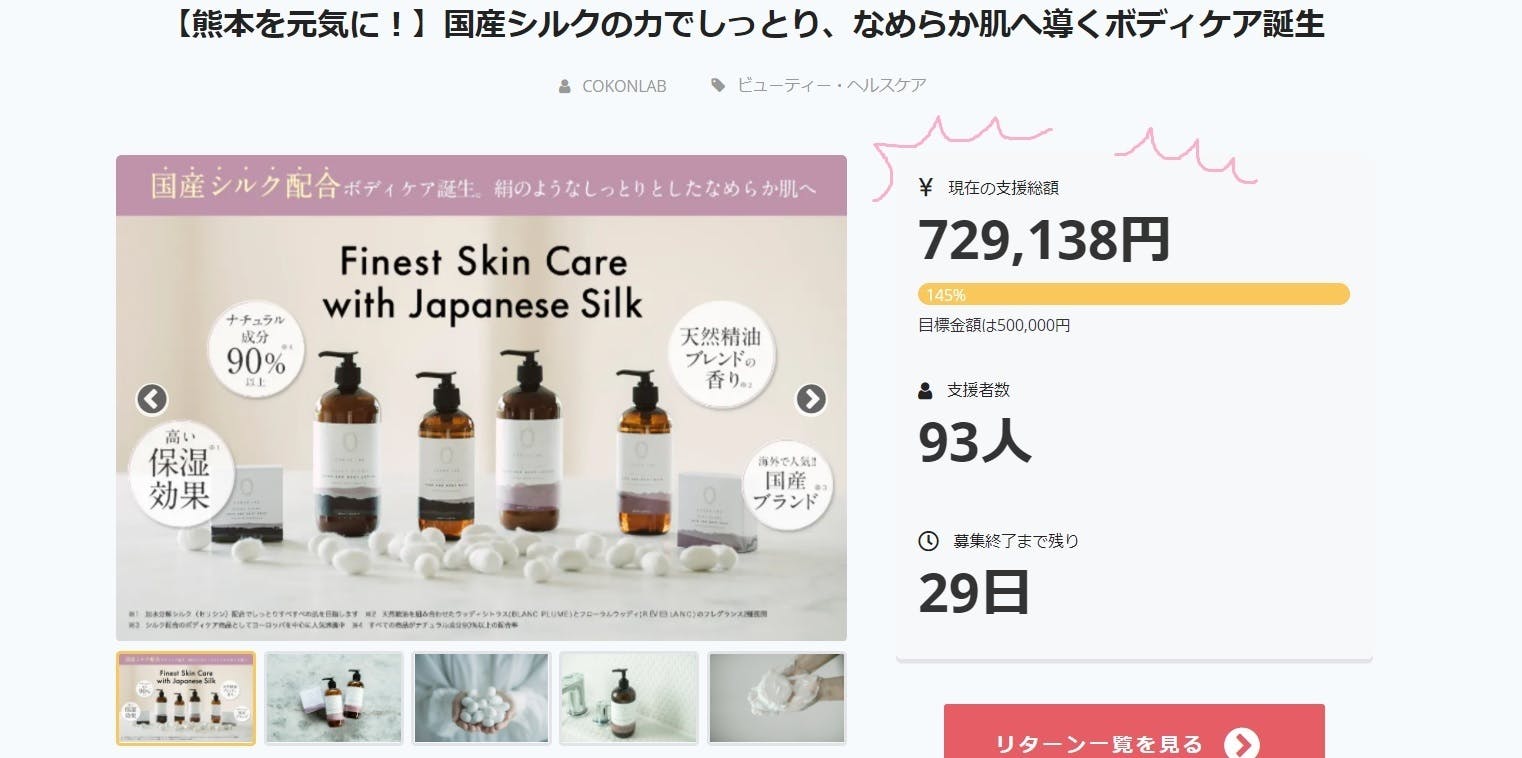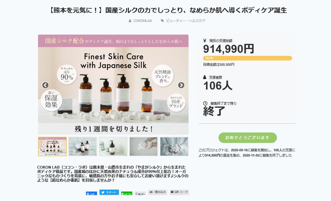 2020/11/09 17:50この度は、COKON LABクラウドファンディングプロジェクトに、たくさんのご支援と応援をいただき、誠にありがとうございました。2020年11月5日をもって、『【熊本を元気に!】国産シルクの力でしっとり、なめらか肌へ導くボディケア誕生】』は無事終了となりました。クラウドファンディング開始スタートからわずか5日間(2020年9月21日時点)で、目標金額50万円を達成することができ、その後も皆様からの温かいご支援により、最終金額は914,990円を達成することができました。COKON LABとして、クラウドファンディングPJを立ち上げたのは今回が初めてでしたが、多くの方から励ましのお言葉とご支援をいただけたこと、心より感謝申し上げます。「熊本・山鹿市の国産シルクを日本中に、そして世界中に」を目標に、これからもブランド一丸となって精進してまいります。そして、少しでもCOKON LAB誕生の地である熊本を元気に!!できるよう、これからも頑張って参りますので、引き続き、COKON LABをどうぞ宜しくお願い致します。なお、早速製品の発送準備に取り掛かっておりますので、リターンの発送は11月中旬を予定しております。商品がみなさまのお手元に届くまで、もう少々お待ちいただけたら幸いです。また、引き続き新しい情報等もアップデートされますので、是非COKON LABのインスタグラム等も、チェックされてみてください☆https://www.instagram.com/cokonlab/ それでは皆様のご厚情に、重ねて深謝申し上げます。この度は本当にありがとうございました。COKON LABスタッフ一同 もっと見る