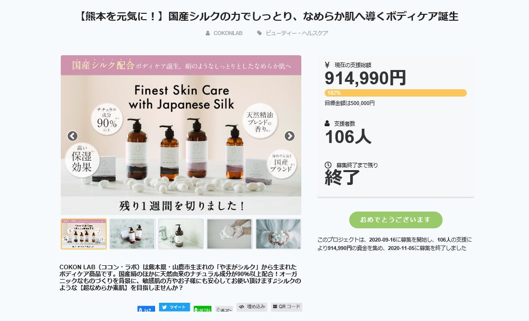 2020年11月5日をもって、『【熊本を元気に!】国産シルクの力でしっとり、なめらか肌へ導くボディケア誕生】』は無事終了となりました。
