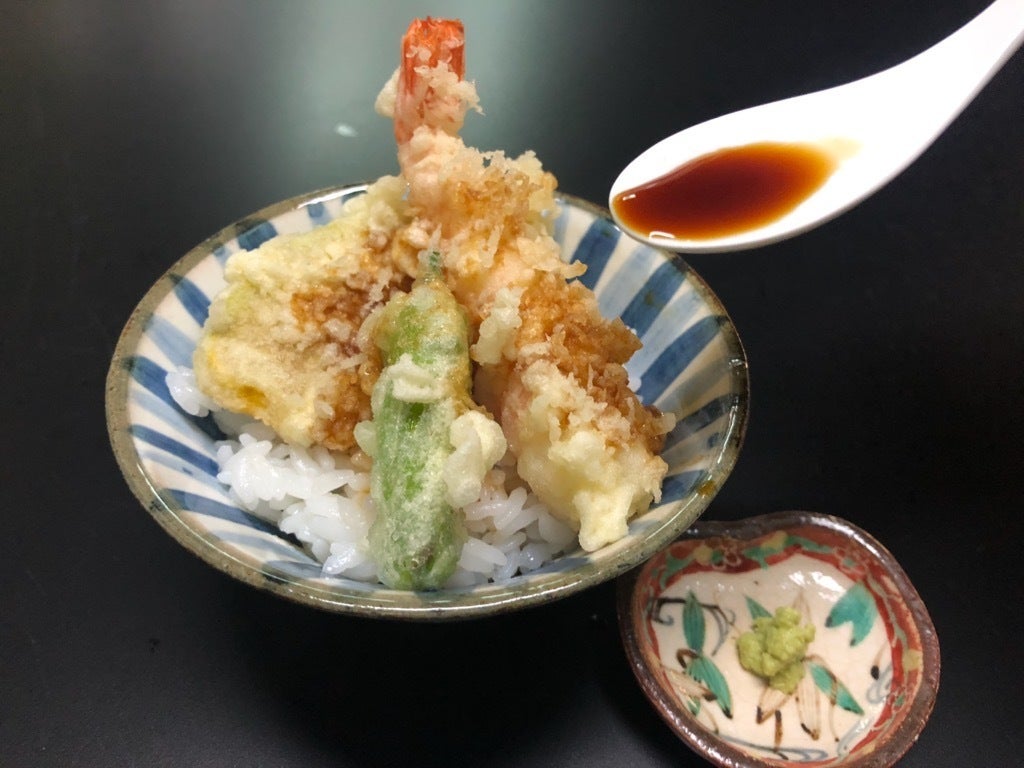 天ぷらに「どんタレ」をかけて山葵を添えれば極上の天丼が完成。