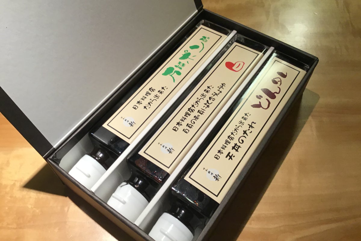日本料理 新では全部で4種類の醤油を販売していますが、今回紹介させていただくのは特に人気が高い「白・万能ポン酢・どんタレ」の3種類の醤油です。
