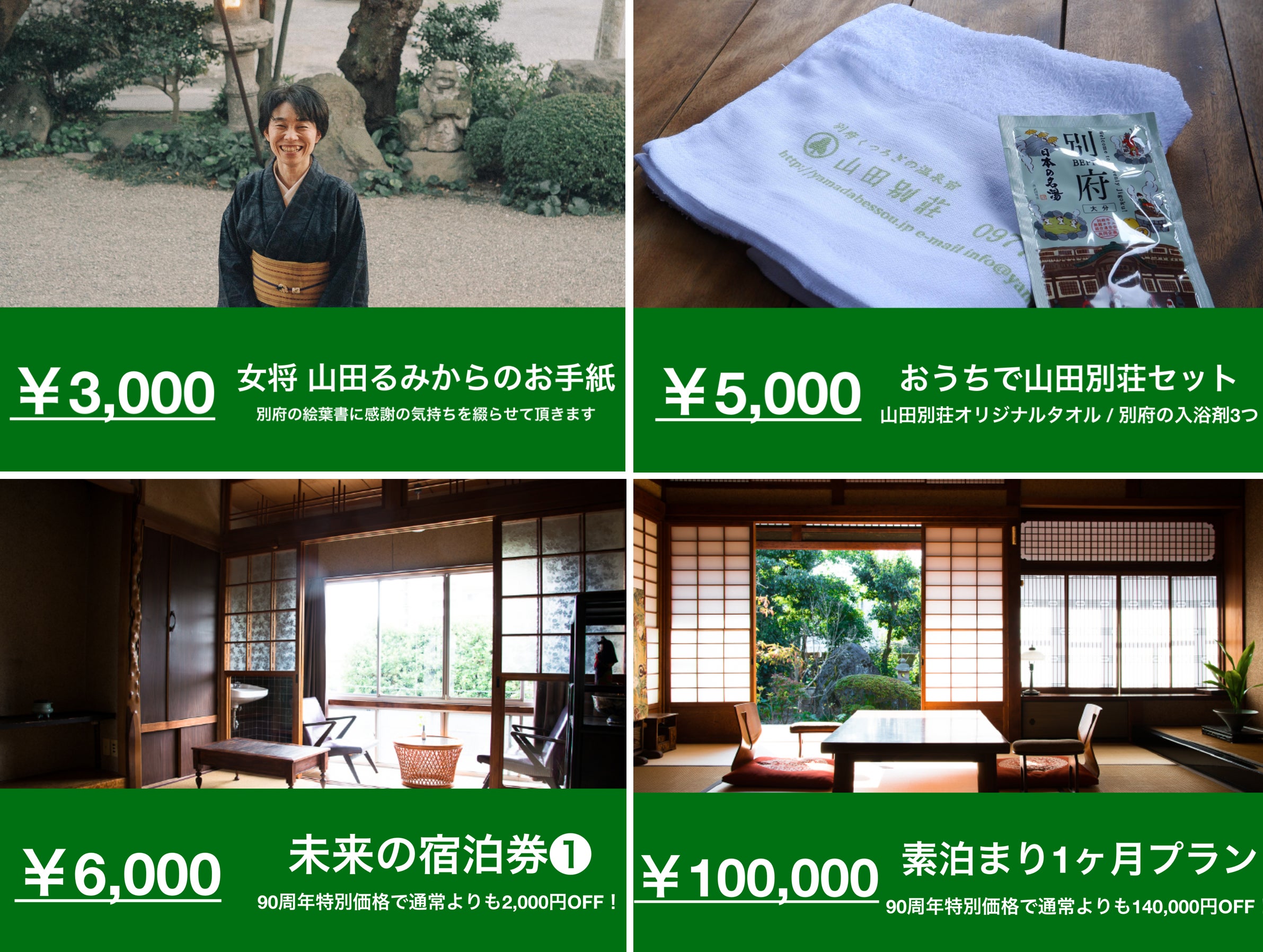今年は、皆様のお陰で無事90年を迎える事が出来、大変感謝しております。 私は、山田別荘を多くの皆様に愛される別府の宿となる様に、今迄やって来ました。 それは、この家を建てた、山田英三が思い描いていた『家族親族が末長く仲良くこの場所を守って欲しい』と言う思いを知って、先祖の築いてきた大好きなこの家を守る為でした。 今迄、お付き合いして頂いた皆様への感謝の気持ちと、次の世代に受け継ぐ為に、クラウドファンディングに挑戦してみました。 今迄のお客様は勿論、新しい広がりを作っていく為に、チャレンジしております。どうぞ、皆様これからの、山田別荘もお楽しみに!!