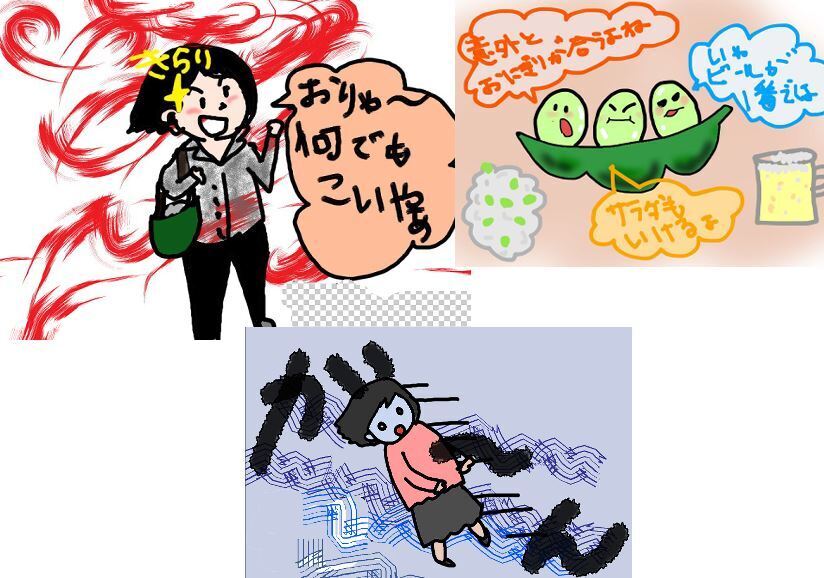 最終日、ついにカウントダウン始まります・・・そこで、今回の活動レポートは私の下手な絵の恥を忍んで、イラストのコミュ力について書かせていただきます!(レッスン動画のイラストは、私は描いていませんので、ご安心を!笑)身内でのラインでの会話に、ちょくちょくイラストを入れます。上記のイラストは、仕事をがんばるぞ~とか、仕事で失敗してしまった・・・とか、枝豆おにぎりたべたよ~と他愛もないものです。絵を描いていると、例えば、仕事が失敗した時は、「ま、いっか、明日からがんばろ~」とか、やる気が出てるときは「よっしゃ~~」って気合がはいったり。イラストをかくと、そんな、ステキな効果もあるんです!ラインでおくると、それを読んだ友人らも「くすっ」と笑ってくれ、けっこう盛り上がります。ラインのスタンプもそうですが、絵って、言葉より感情に直接訴える感じがしますよね!そして、そんな絵は、けっしてプロみたいに上手である必要はないんです!皆さんも、お気軽にデジタルお絵描きを楽しんでみてください。