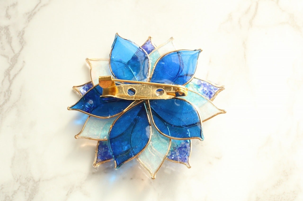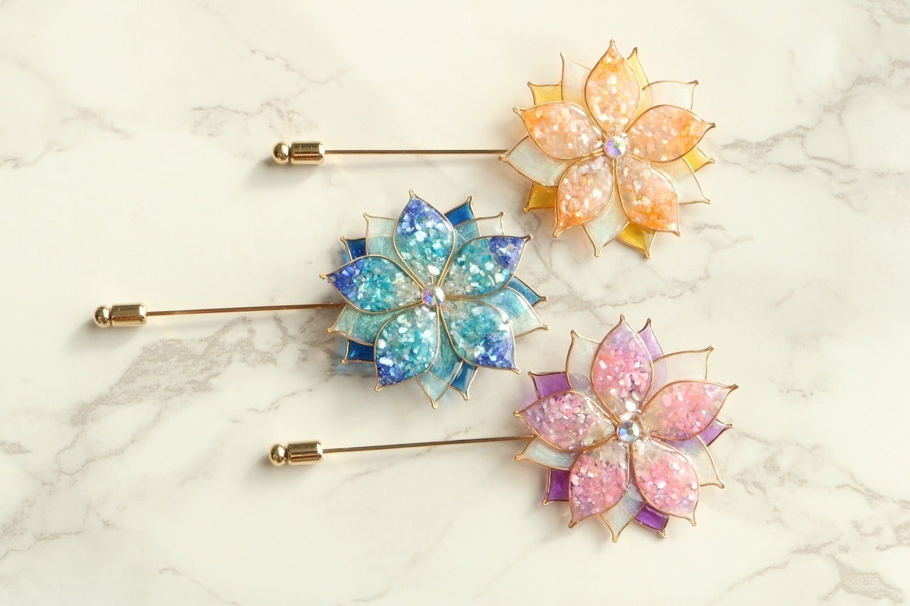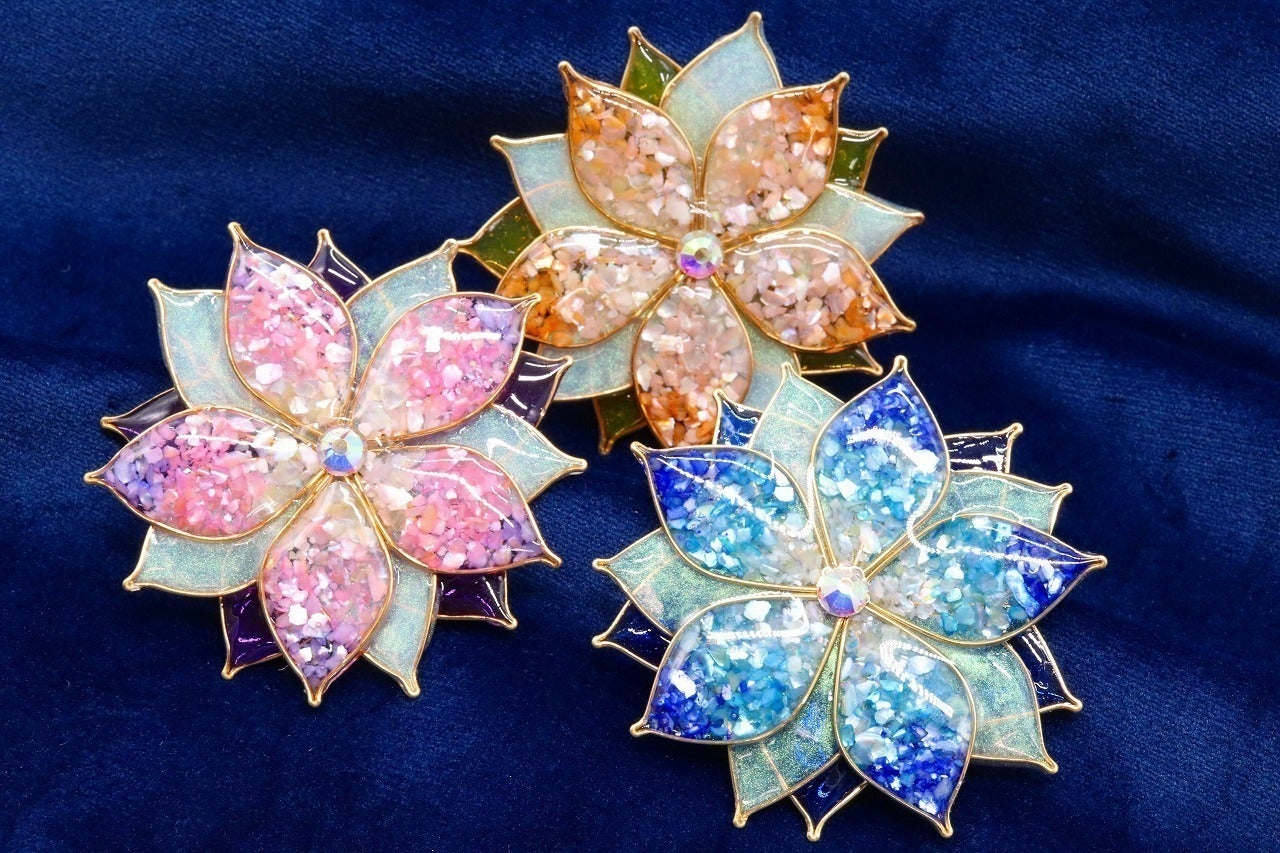 ワイヤーと樹脂を使用して、1枚1枚丁寧に作られた3段の花びらには、1段ずつ配色を変えたデザインになっており、上段の花びらにはたくさんのシェルが散りばめられ、光の反射がとてもきれいです!トップストーンにはスワロフスキーを使用し、お祝いの席にもご活用いただけます。「花のように自分らしく精一杯に輝いてほしい」そんな思いが込められています。