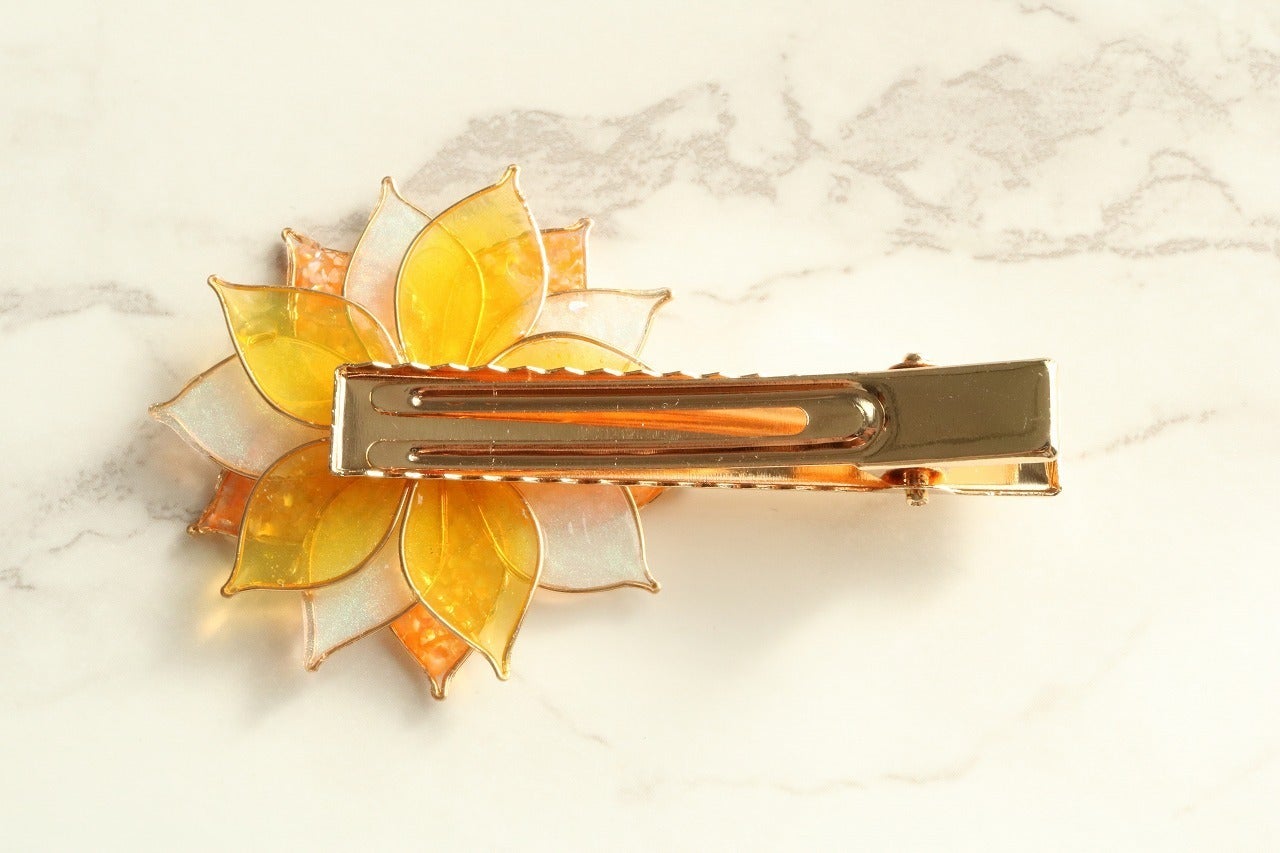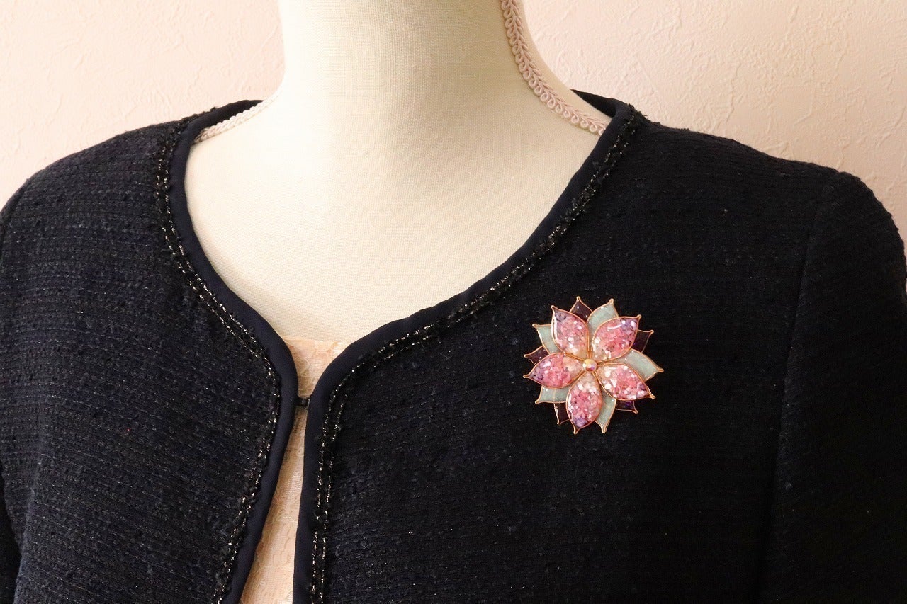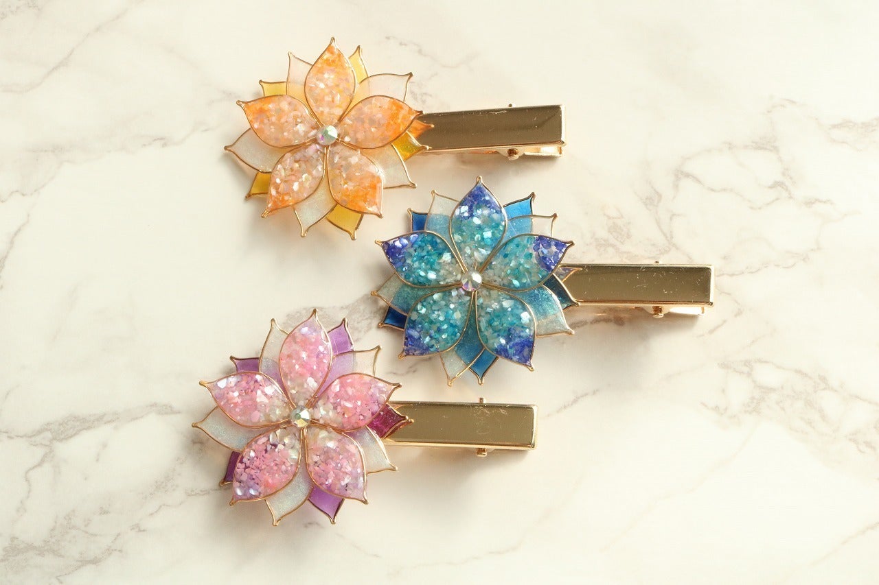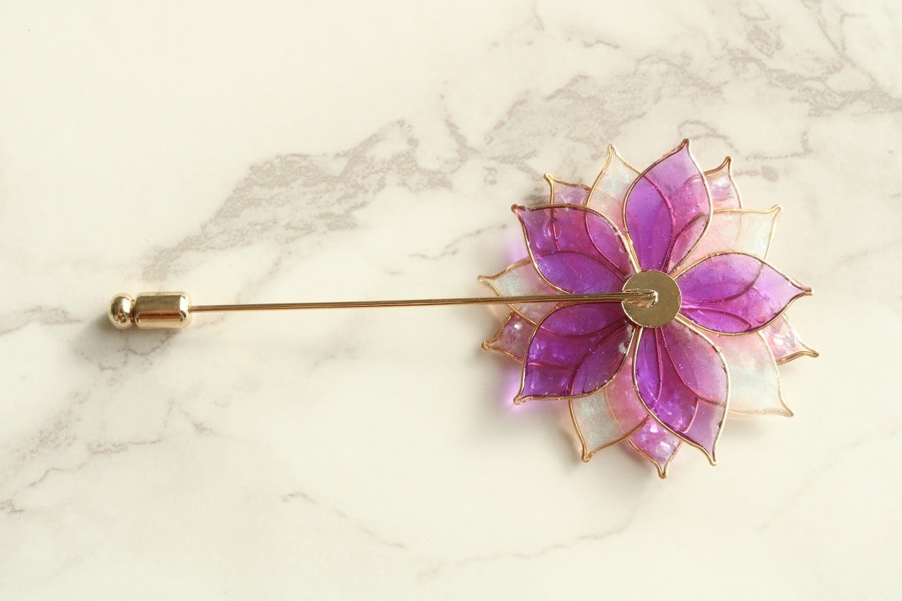 ワイヤーと樹脂を使用して、1枚1枚丁寧に作られた3段の花びらには、1段ずつ配色を変えたデザインになっており、上段の花びらにはたくさんのシェルが散りばめられ、光の反射がとてもきれいです!トップストーンにはスワロフスキーを使用し、お祝いの席にもご活用いただけます。「花のように自分らしく精一杯に輝いてほしい」そんな思いが込められています。