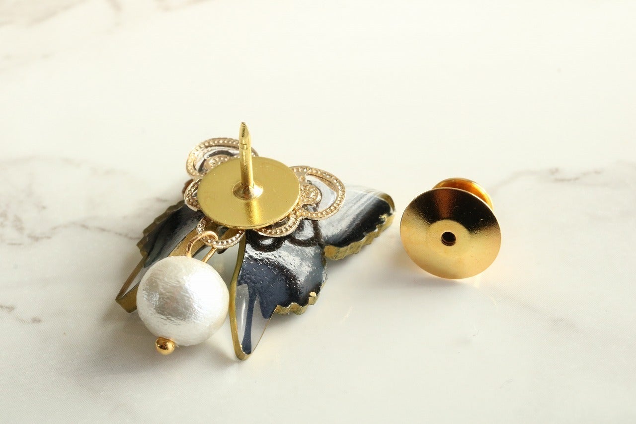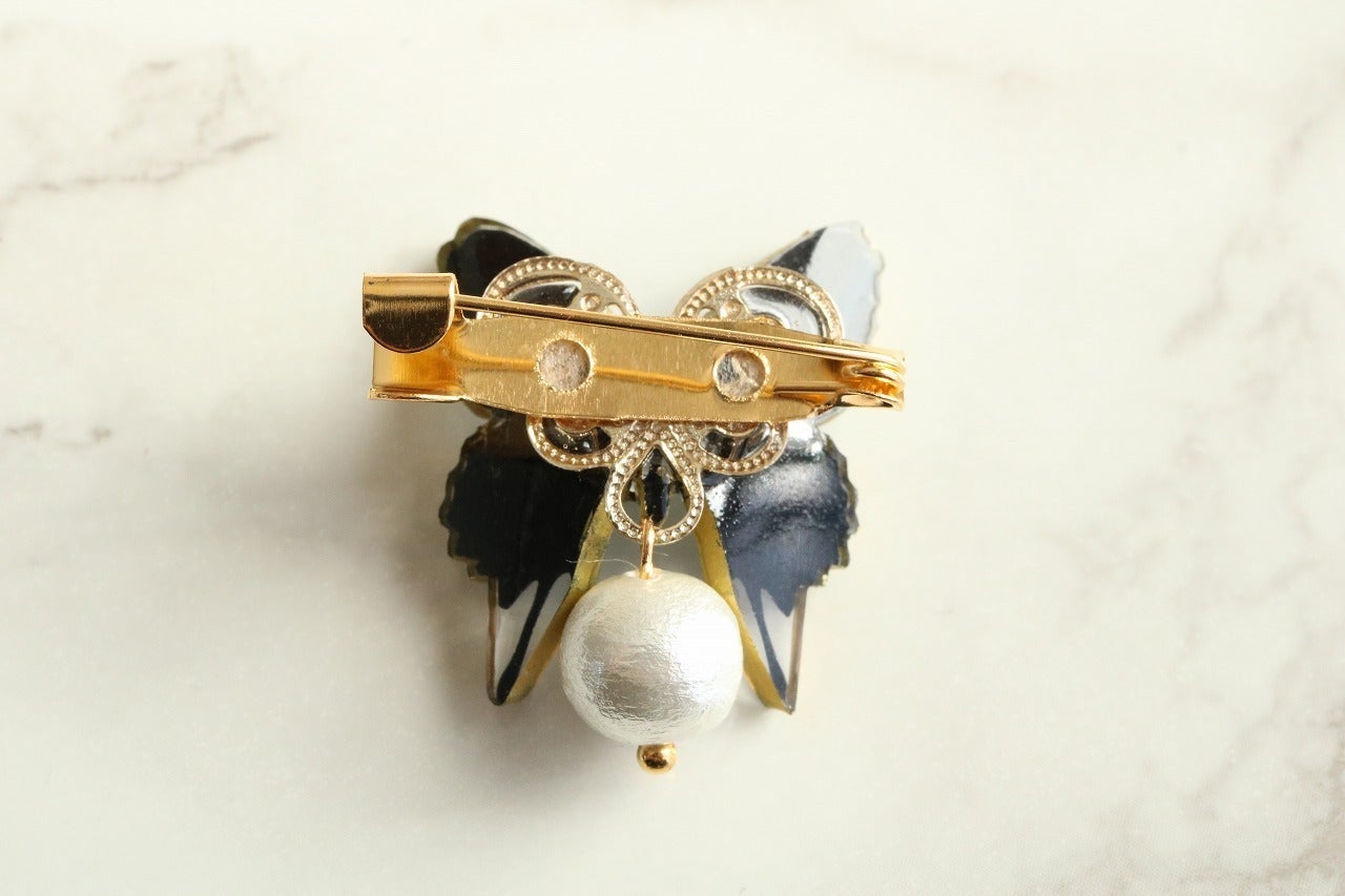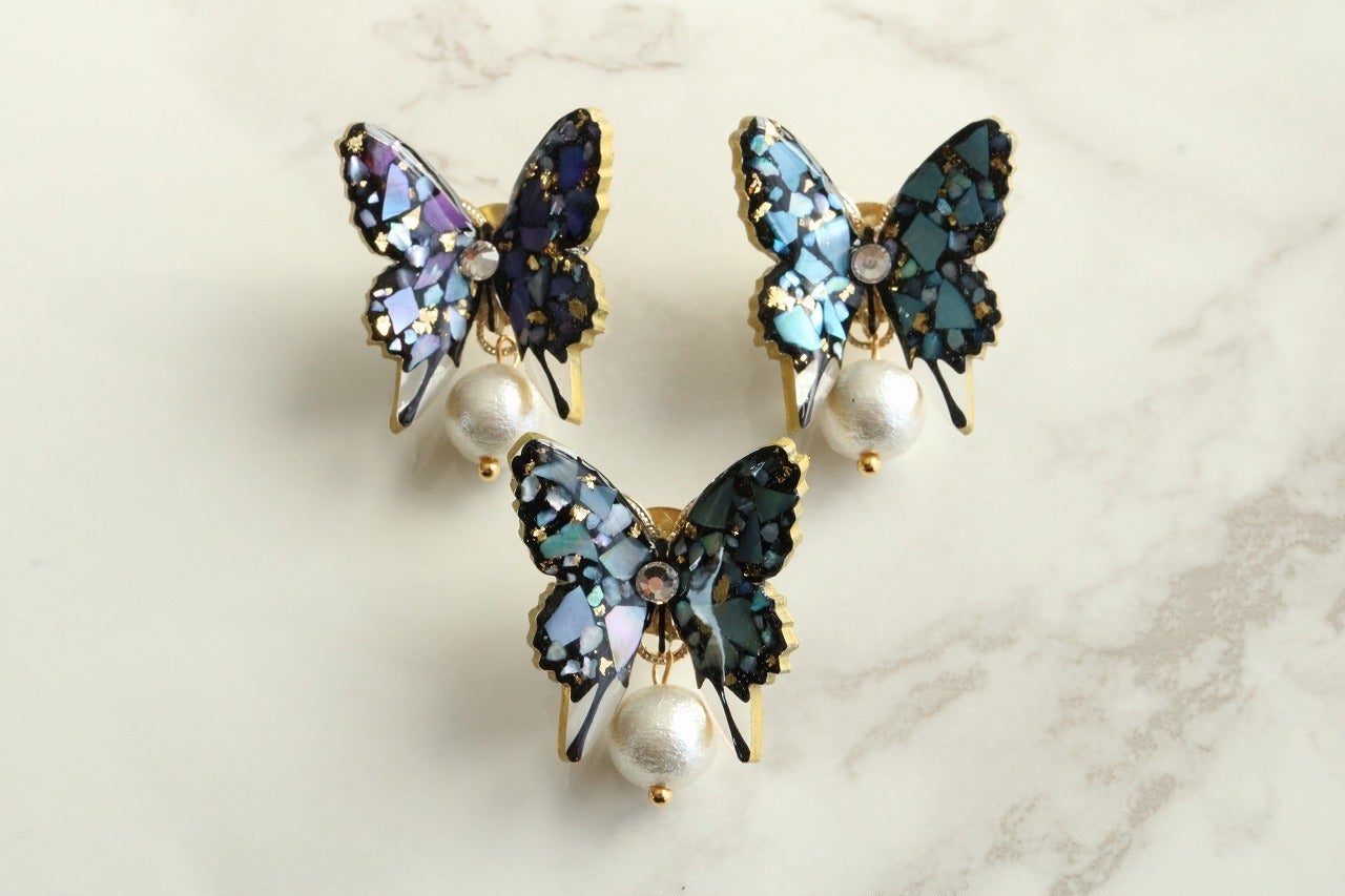 「美」や「喜び」を表す縁起物の蝶をモチーフに、「女性らしさを引き出す」とされるコットンパールを合わせました。蝶の羽には少しの角度が付けられ、まるで羽を休めてるような臨場感があります。ブラックをベースにパープル、ブルー、ホワイトのシェルと金が散りばめられ、トップストーンにはスワロフススキーを使用。生地に負担のない軽量さを兼ねた、高級感溢れるデザインになっています。「着ける人にもそれを目にする人にも幸せを運んでほしい」そんな思いが込められています。