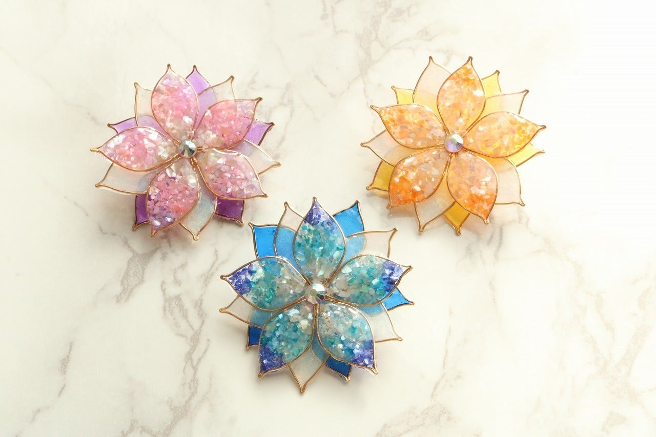 ワイヤーと樹脂を使用して、1枚1枚丁寧に作られた3段の花びらには、1段ずつ配色を変えたデザインになっており、上段の花びらにはたくさんのシェルが散りばめられ、光の反射がとてもきれいです!トップストーンにはスワロフスキーを使用し、お祝いの席にもご活用いただけます。「花のように自分らしく精一杯に輝いてほしい」そんな思いが込められています。