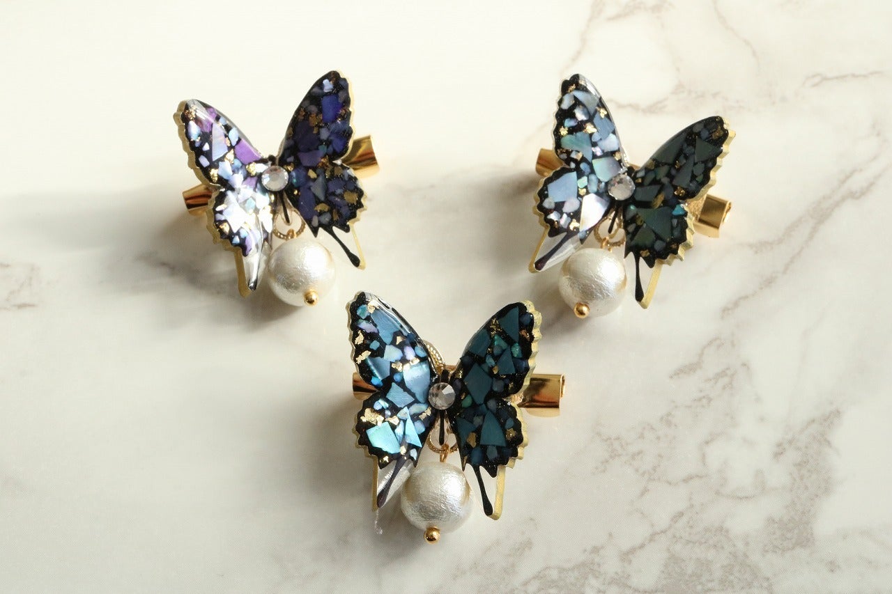 「美」や「喜び」を表す縁起物の蝶をモチーフに、「女性らしさを引き出す」とされるコットンパールを合わせました。蝶の羽には少しの角度が付けられ、まるで羽を休めてるような臨場感があります。ブラックをベースにパープル、ブルー、ホワイトのシェルと金が散りばめられ、トップストーンにはスワロフススキーを使用。生地に負担のない軽量さを兼ねた、高級感溢れるデザインになっています。「着ける人にもそれを目にする人にも幸せを運んでほしい」そんな思いが込められています。