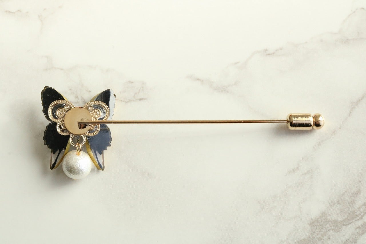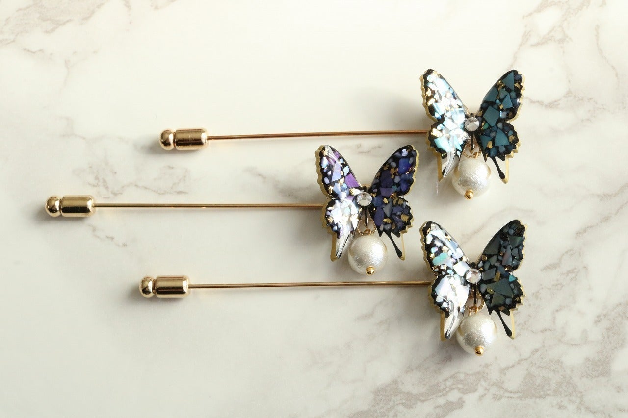 バッチピン、ハットピン、タックピンの3タイプ、3カラーでご用意いたしました。こちらも、ブローチやストールピン、カバンなどの様々なアクセントとしてお使いいただけます。