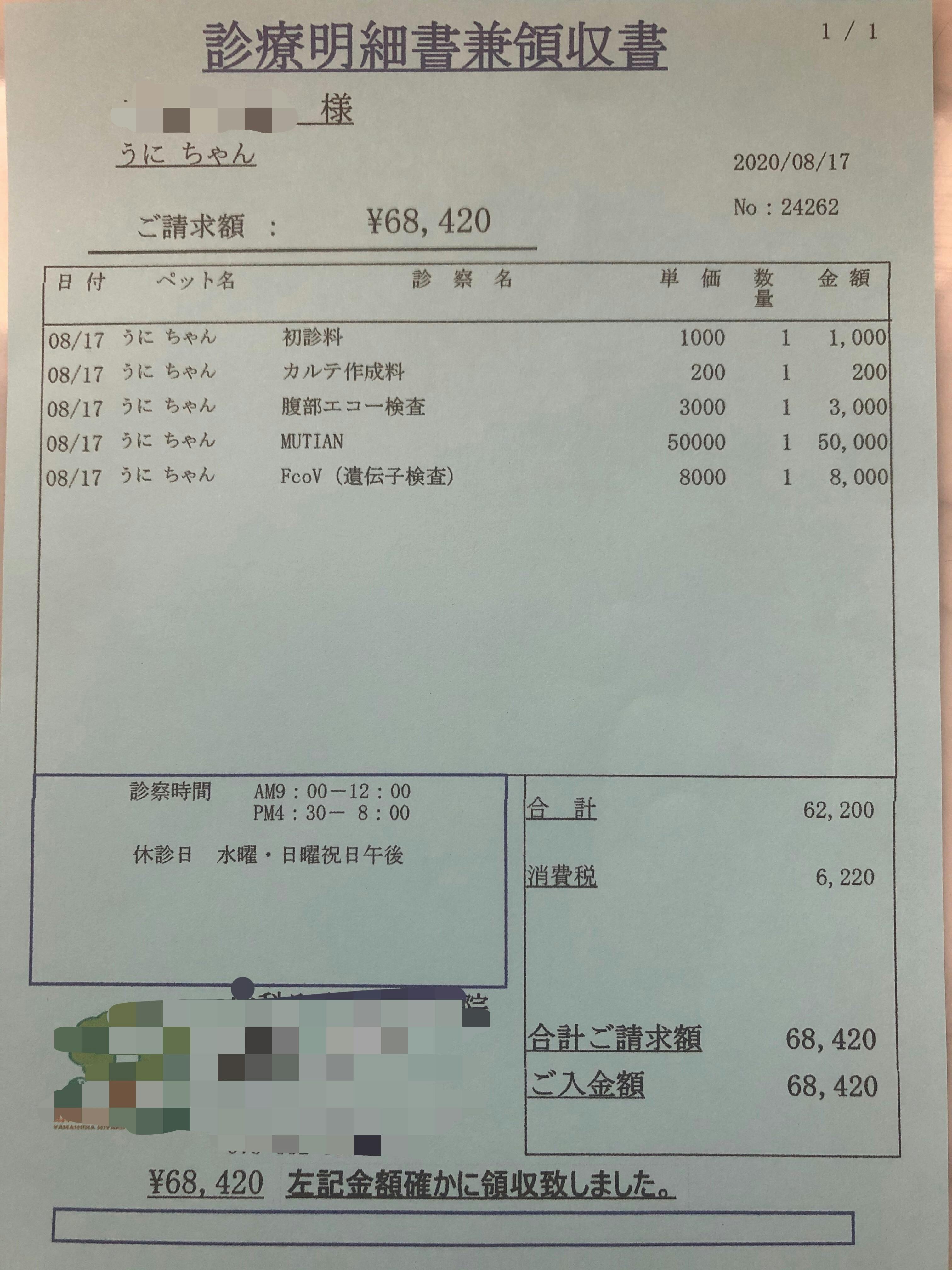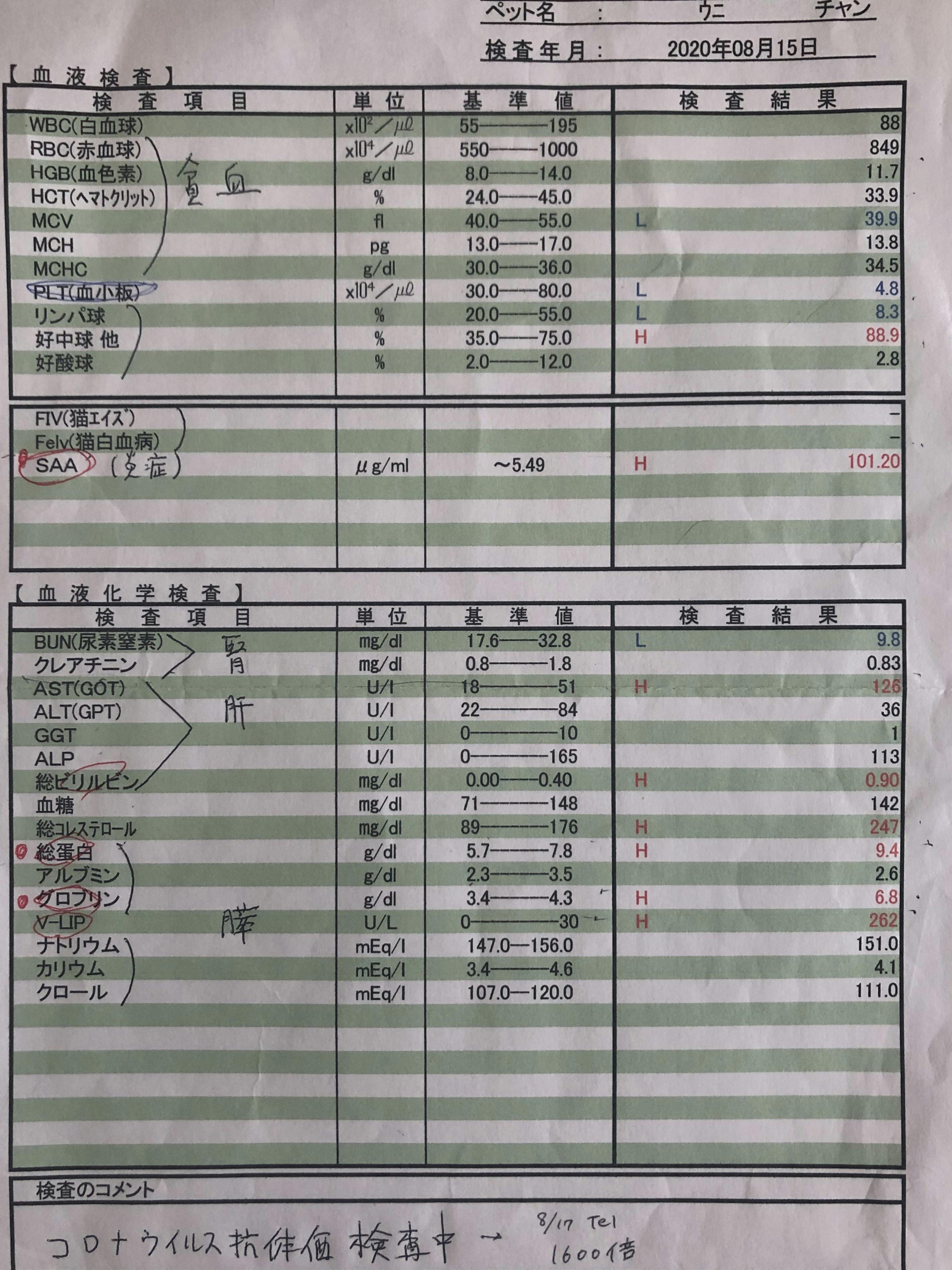2020.8.15まだ食欲が出ないので点滴と血液検査のため半日入院。FIPの可能性が高いと告げられ余命や治療法についての説明を受けました。抗体検査も外注に出して頂きました。