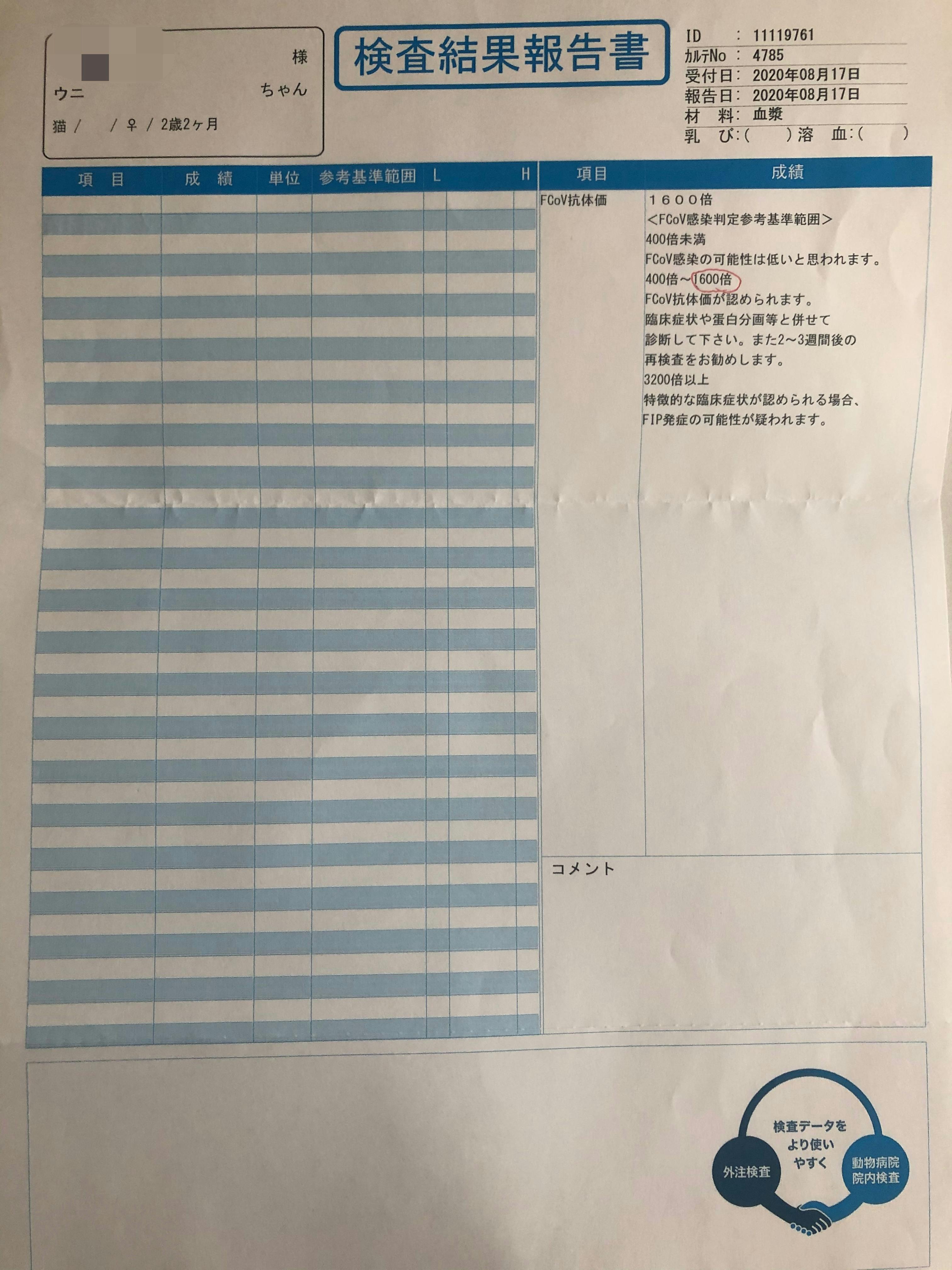 2021/02/13 00:40うにちゃんの経過観察が3か月過ぎ、最後の血液検査をしに病院に行ってきました。体重は4.3キロまで戻り、血液検査の結果も良好で無事寛解となりました。こちらが本日の結果です↓認可されていない薬での治療は半信半疑で不安の中、最後まで続けられたのも応援し、支えて下さった皆様のおかげです。本当にありがとうございました。無事寛解と言われる日を迎えられて本当に嬉しいです!ありがとうございます。うにちゃんも辛い投薬や強制給餌をよく頑張ってくれたと思います◎これからはFIPにかかった猫ちゃんと飼い主様の為に何か役に立てることが出来ればと思っています。長い間見守り応援して下さった皆様には本当に感謝しております。ありがとうございました。また何かご報告することがありましたらこちらでご報告させて頂きます。まだまだ不安が消えない世の中ですが、皆さん健康にお気をつけてお過ごし下さい。ありがとうございました*° もっと見る