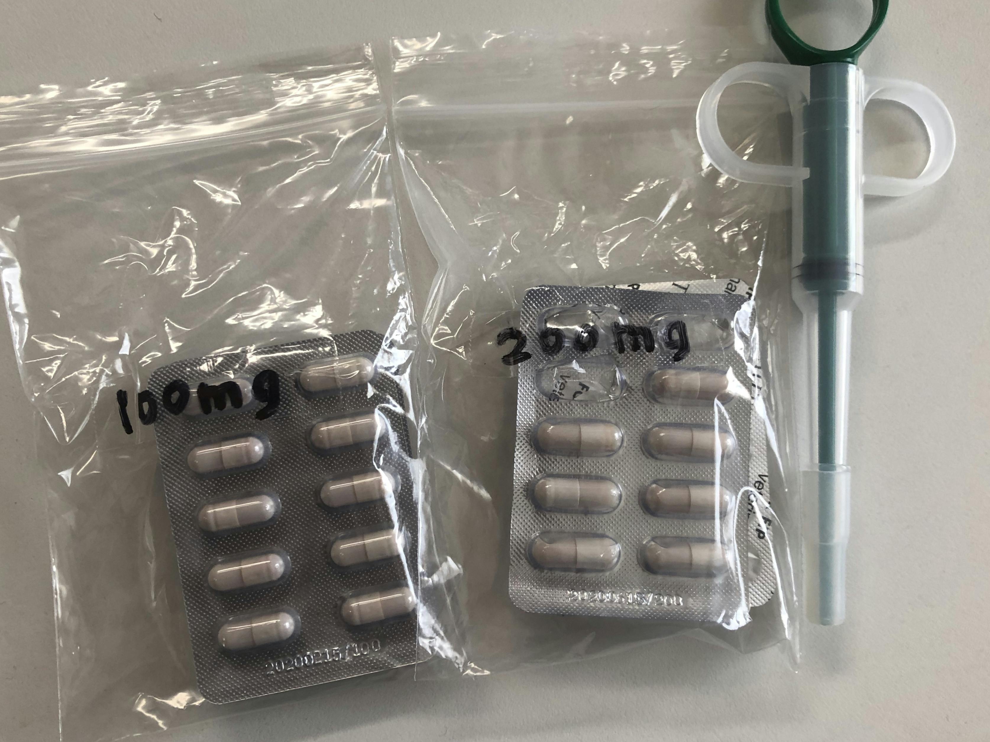薬代は体重の増加により変動します。今現在3.3キロのうにちゃんには300mgの投薬が必要なので1日あたりの薬代が7300円ほどかかります。健康時の体重が4.5キロだったため食欲が戻ってきたら450mgの投与が必要と予想しております。