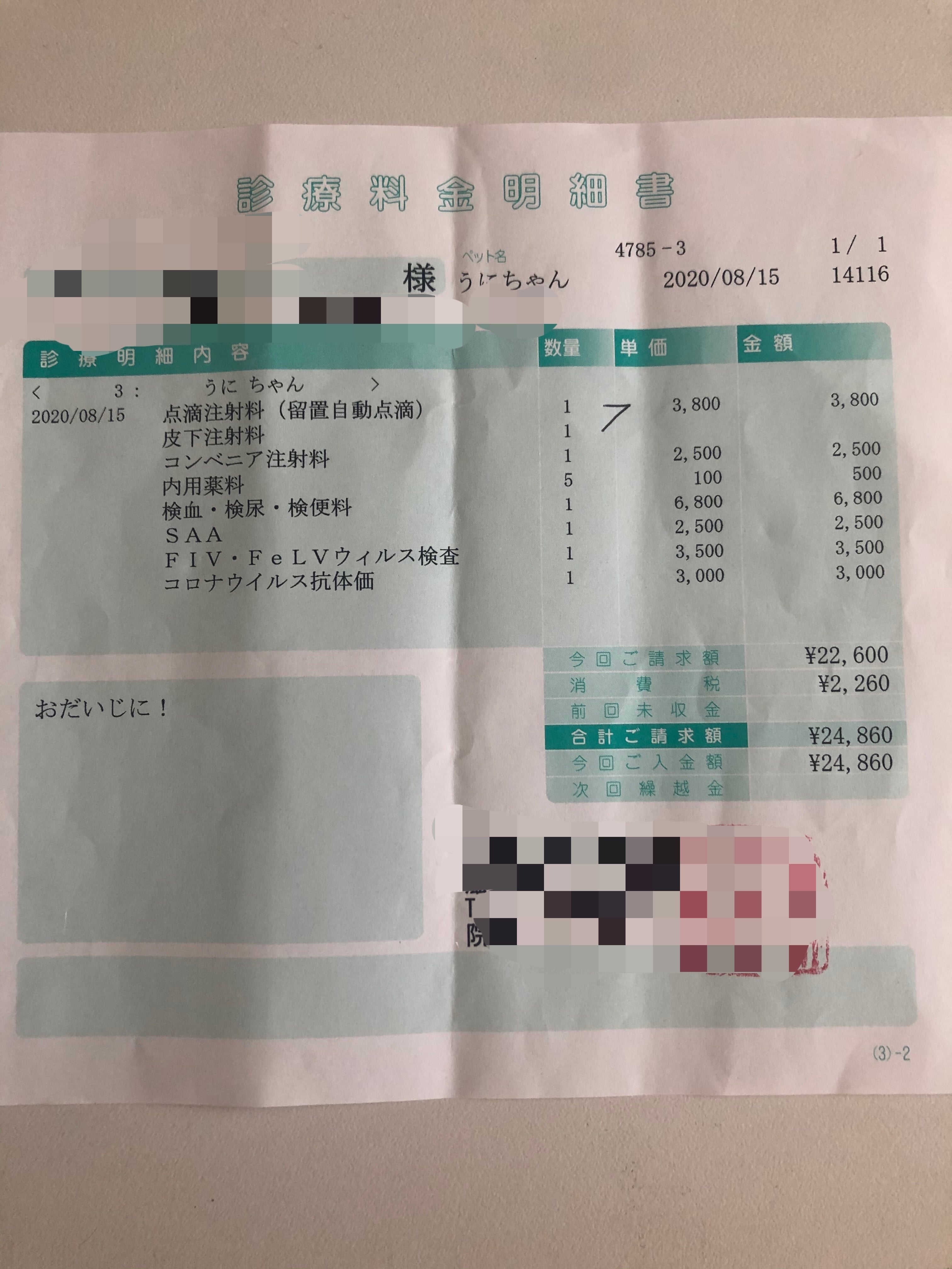 2020.8.15まだ食欲が出ないので点滴と血液検査のため半日入院。FIPの可能性が高いと告げられ余命や治療法についての説明を受けました。抗体検査も外注に出して頂きました。