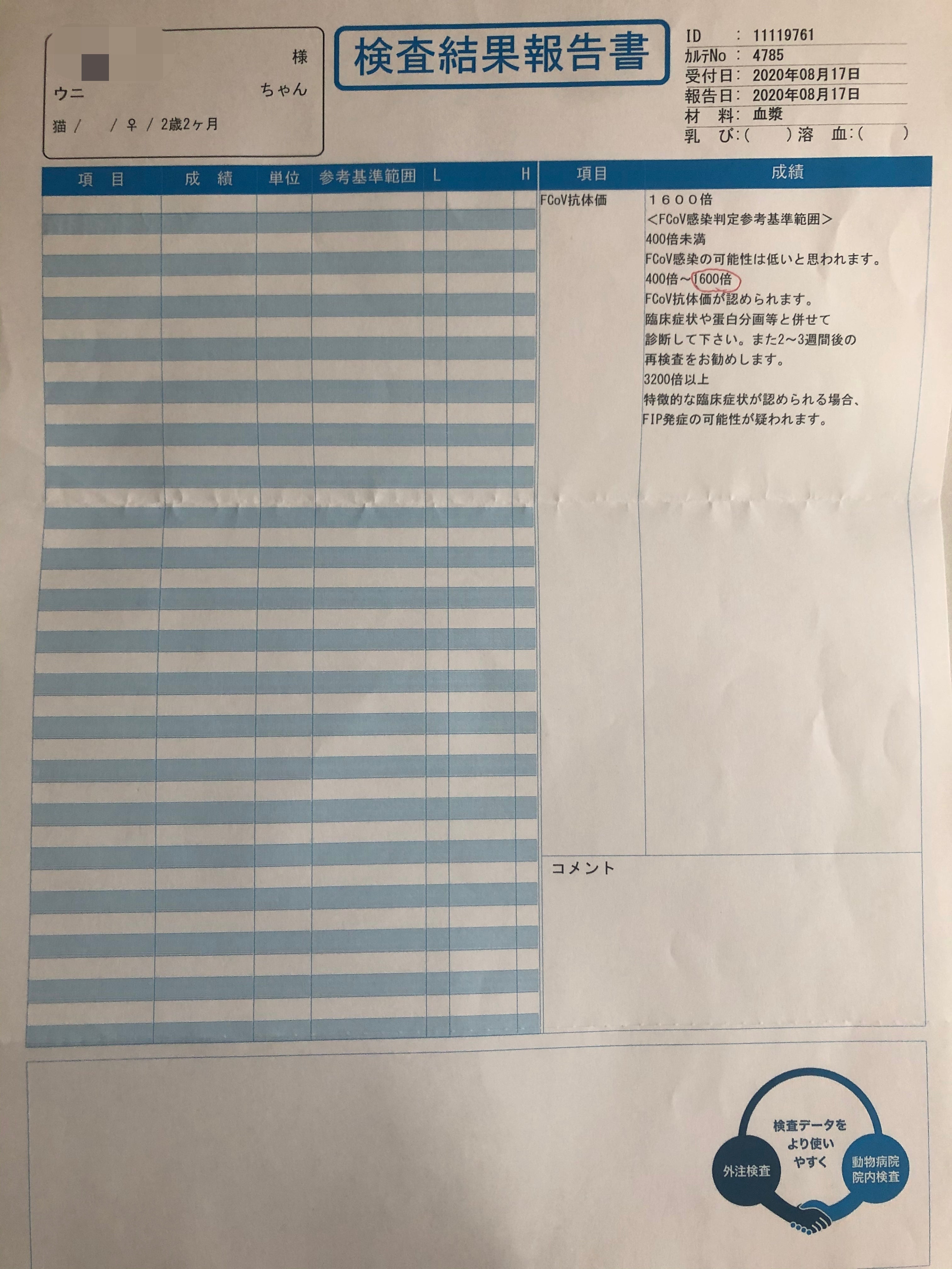 2021/02/13 00:40うにちゃんの経過観察が3か月過ぎ、最後の血液検査をしに病院に行ってきました。体重は4.3キロまで戻り、血液検査の結果も良好で無事寛解となりました。こちらが本日の結果です↓認可されていない薬での治療は半信半疑で不安の中、最後まで続けられたのも応援し、支えて下さった皆様のおかげです。本当にありがとうございました。無事寛解と言われる日を迎えられて本当に嬉しいです!ありがとうございます。うにちゃんも辛い投薬や強制給餌をよく頑張ってくれたと思います◎これからはFIPにかかった猫ちゃんと飼い主様の為に何か役に立てることが出来ればと思っています。長い間見守り応援して下さった皆様には本当に感謝しております。ありがとうございました。また何かご報告することがありましたらこちらでご報告させて頂きます。まだまだ不安が消えない世の中ですが、皆さん健康にお気をつけてお過ごし下さい。ありがとうございました*° もっと見る